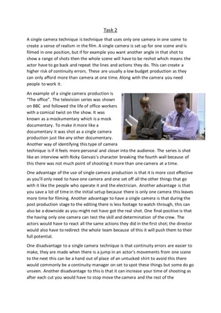 The document discusses single camera filmmaking techniques. It notes that a single camera setup allows filming of one scene at a time from one angle, requiring reshoots if additional angles are needed. This can increase continuity errors. Examples given of single camera productions include the TV show The Office. Advantages include lower costs and faster setup times, while disadvantages include greater risk of continuity errors and not having alternative camera angles.