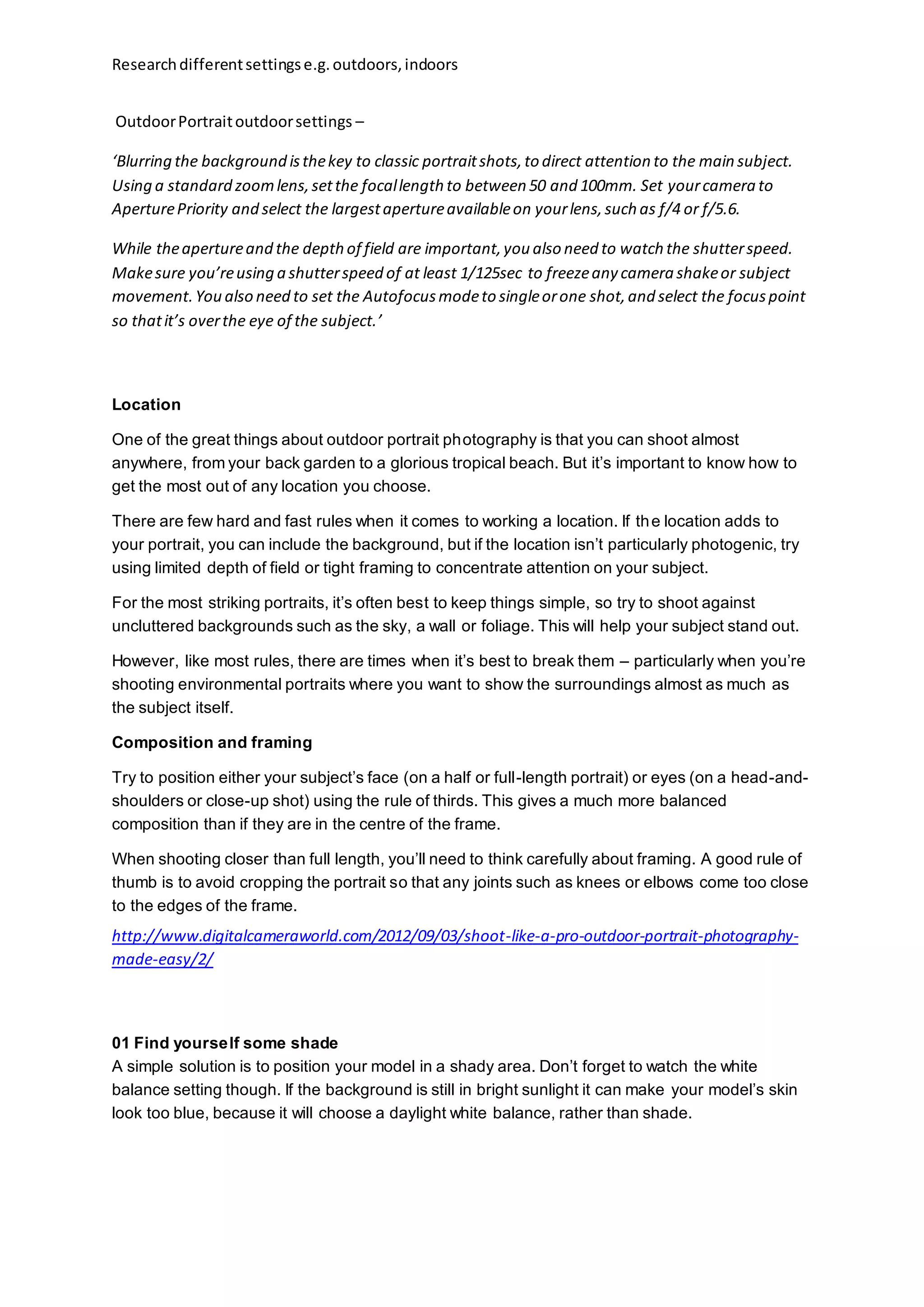The document provides tips for outdoor and indoor portrait photography. For outdoor portraits, it recommends using a zoom lens between 50-100mm, large aperture such as f/4 or f/5.6, shutter speed of at least 1/125s to freeze movement, and single autofocus. It discusses choosing good outdoor locations and compositions using rule of thirds. For indoor portraits, it suggests using natural window light, reflectors, 85mm prime lens, wide apertures, higher ISO settings, focusing on the eyes, finding photogenic models, engaging with subjects, and basic post-processing tips.