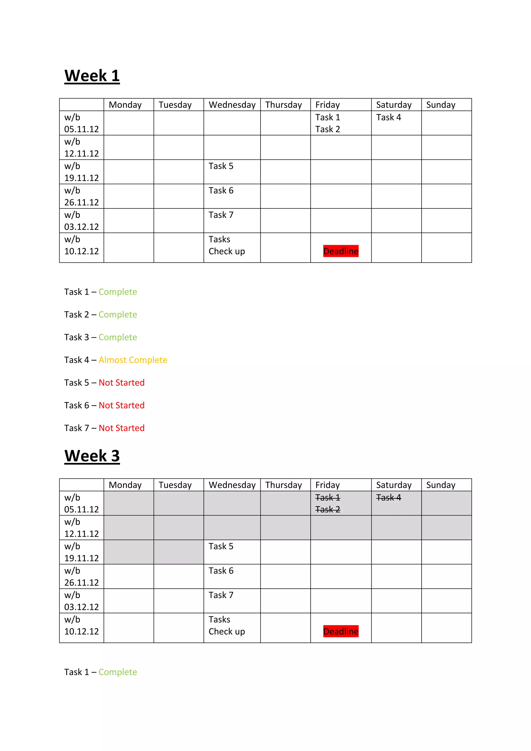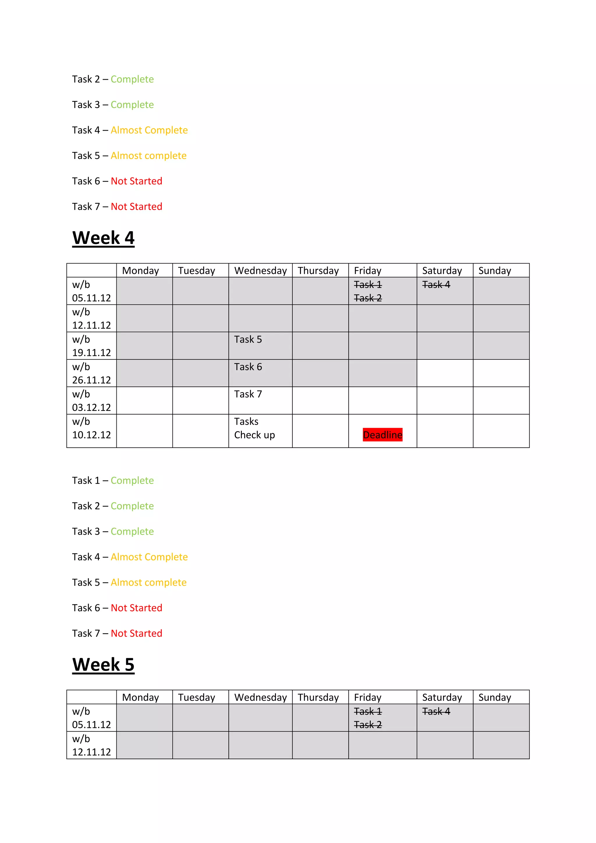 This document outlines the progress of 7 tasks over 7 weeks. It shows the tasks scheduled for each day. For the first 5 weeks, tasks 1-4 were complete, task 5 was almost complete, and tasks 6-7 were not started. By week 7, tasks 1-6 were complete and task 7 was in progress, with comments added on dates showing progress on character animation tasks in Flash.