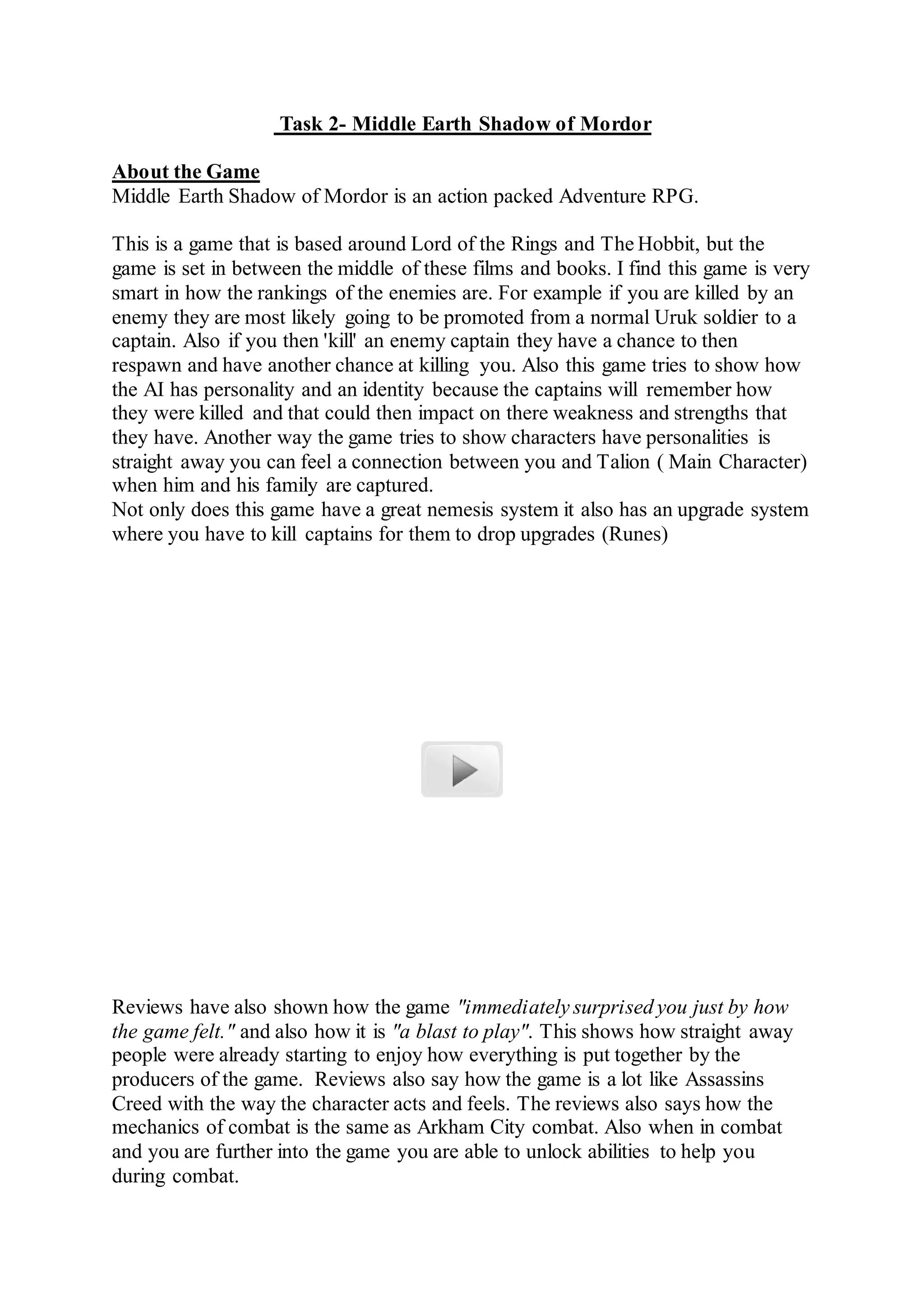 Middle Earth Shadow of Mordor is an action RPG set between The Hobbit and Lord of the Rings. The game features a nemesis system that tracks enemies and has them develop personalities and strengths based on past encounters with the player. Reviews praised the fun combat and nemesis system, saying the game feels like a blend of Assassin's Creed and the Arkham series. The story follows Talion seeking revenge after his family is killed, as he works to understand the uruk hierarchy and defeat the three Black Captains leading Sauron's forces.