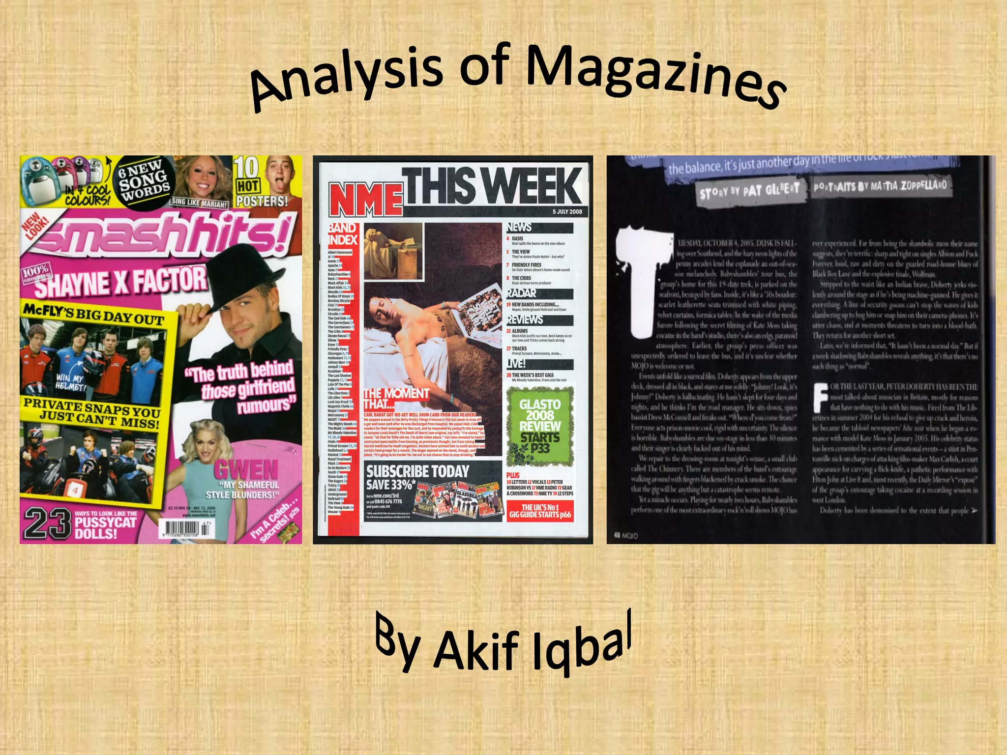 The document analyzes the design elements of magazine covers and pages. It discusses the purpose of elements like mastheads, headers, dates, images, colors and layouts. The goal is to attract readers and target specific audiences using visual styles and prominent features that draw attention and convey information about the content. Elements are carefully designed and placed to market the magazines effectively.