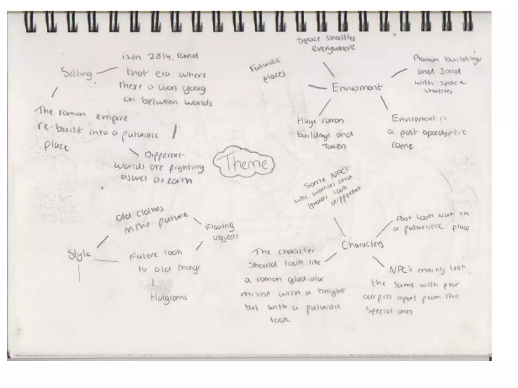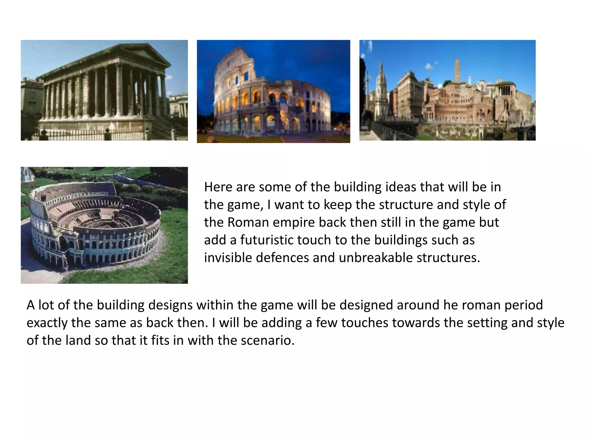The document discusses building and character designs for a game set in a futuristic Roman empire. Buildings will have a Roman structure but with invisible defenses and unbreakable materials. Armor designs keep the classic Roman style while incorporating powerful, lightweight materials befitting a general. Weaponry blends classic Roman designs with futuristic elements like spirit shields, maintaining an interesting blend of past and future aesthetics. Drawings showcase the envisioned classic Roman warrior appearance with subtle modern additions to armor and weapons.