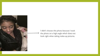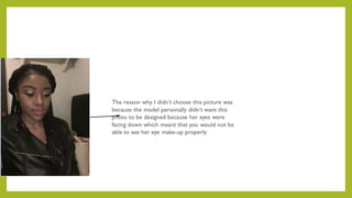 The photographer used a clear handheld picture of the model's full face for the magazine cover because it showed important details. Natural lighting was originally planned for the outdoor shoot but it got dark, so indoor lighting from a light bulb was used instead. While some pictures used flash, others did not, and the photographer found pictures without flash made the model's face stand out more. The chosen picture worked well but one picture was rejected because the flash made the model's face look ashier than in person. The overall magazine cover outcome was good after considering different designs and tools. Makeup magazines that post makeup articles regularly inspired the cover's focus on the model's face and eye makeup.