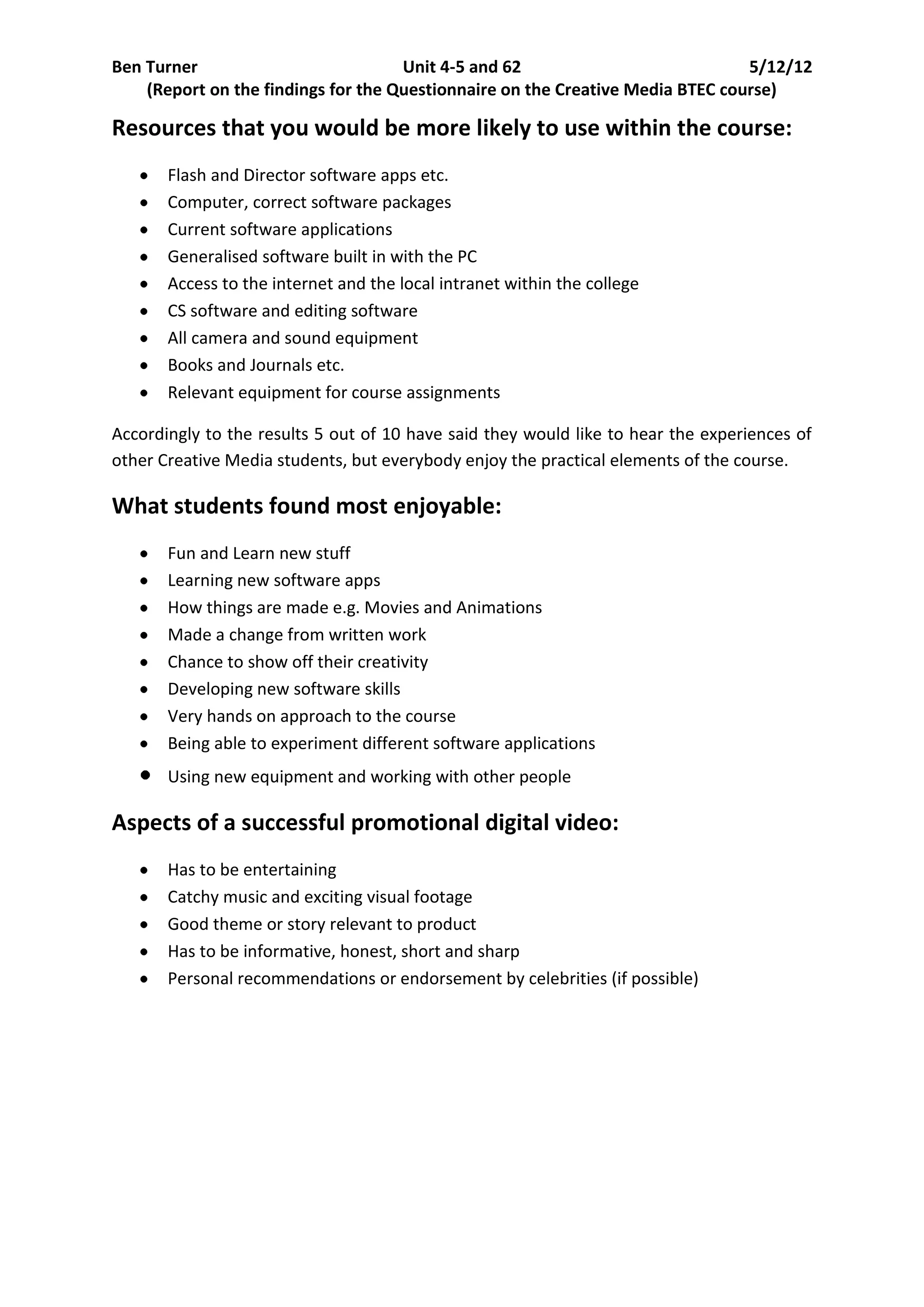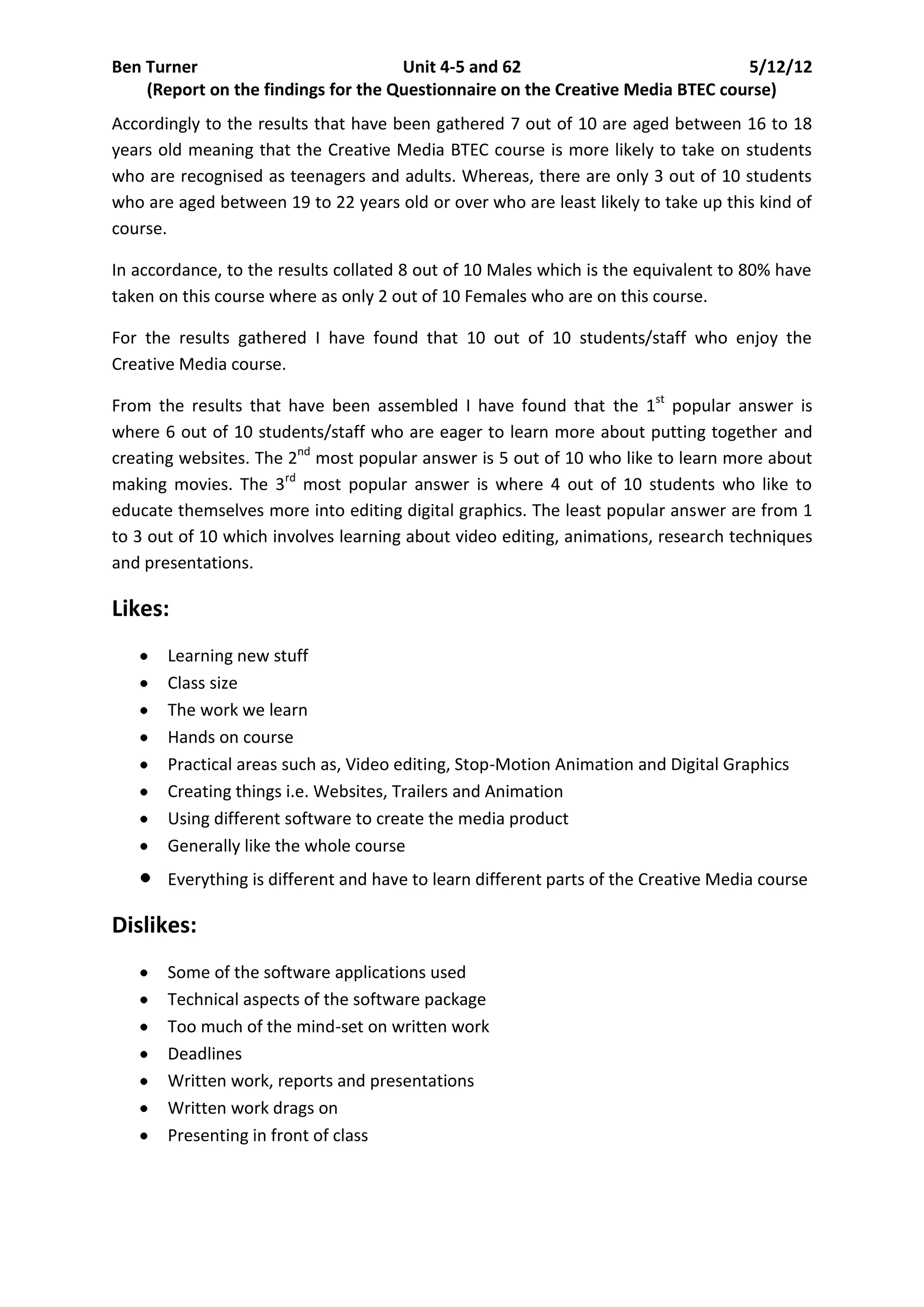 The document summarizes the results of a questionnaire given to students on a Creative Media BTEC course. It finds that most students on the course are teenagers between 16-18 years old. It also finds that most students, 80%, are male. The most popular areas of interest for students to learn more about are websites, movies, and digital graphics. Students generally enjoy the practical hands-on elements of the course and learning new software.