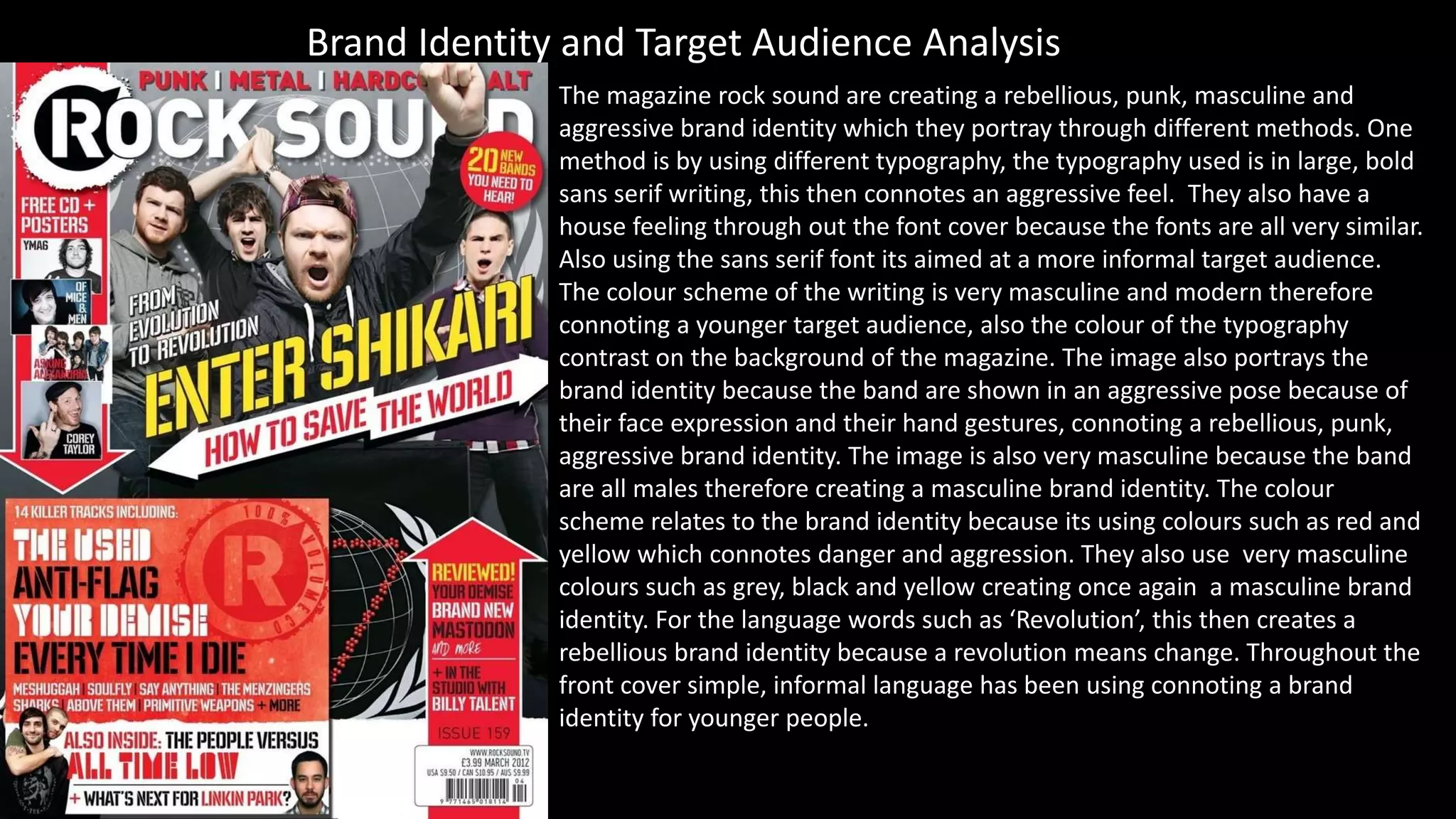 The magazine aims to create a rebellious, punk, masculine and aggressive brand identity through various design elements. These include using bold sans-serif typography, masculine color schemes featuring red and black, and images depicting bands in aggressive poses. The language used also aims to portray a rebellious identity through words like "revolution". Together, these visual and linguistic elements target a younger, informal audience and establish a consistent brand across the front cover, context page, and double page spread.