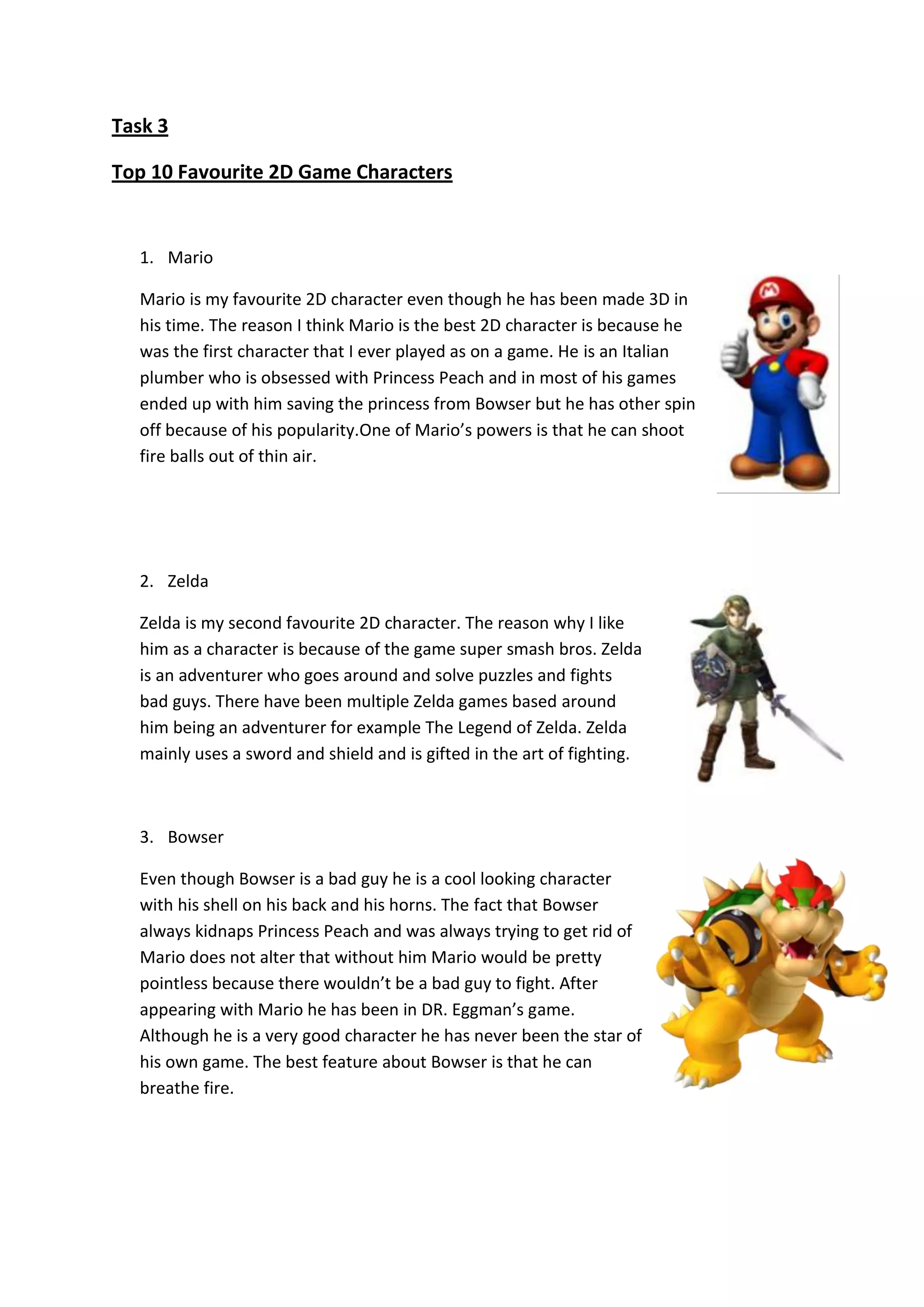 The document provides a top 10 list of favorite 2D game characters. Mario is listed as the favorite for being the first character played and for consistently saving Princess Peach from Bowser. Zelda, who is actually a male character, is next for being featured in games like The Legend of Zelda. Bowser, despite being a villain, is seen as a cool character. Knuckles, Donkey Kong, Kirby, Sonic, Shadow, Yoshi, and Samus Aran round out the remaining spots on the list. Reasons for each character's inclusion involve their roles in games, appearances, powers or abilities.