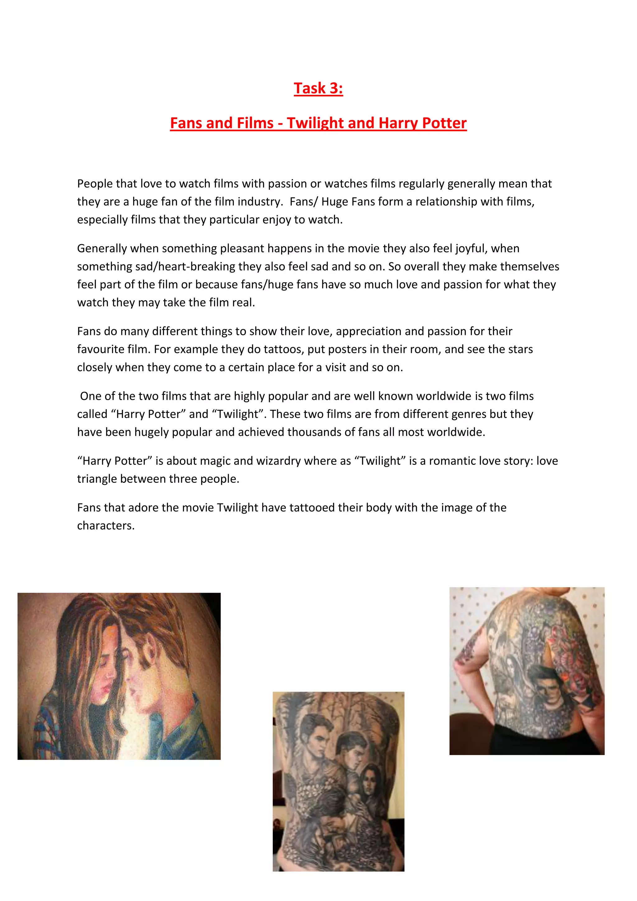 This document discusses fans of the films Harry Potter and Twilight and how they demonstrate their fandom. It notes that fans form deep connections with films they enjoy and feel like they are part of the story. Big fans of Twilight have tattoos of the characters, while Harry Potter fans dress up in costumes from the films. The document also describes how the film sets of Harry Potter have been constructed as tourist attractions due to the popularity of the films. Both films provide emotional pleasures to fans through their stories but Harry Potter also incorporates intellectual puzzles and visceral thrills. Overall, fans are deeply invested in films and strive to immerse themselves in the worlds created on screen.