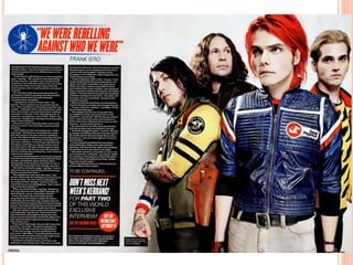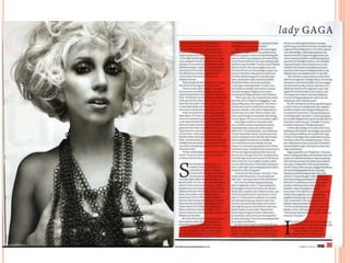 This document analyzes the page layout of two magazine articles. For the Lady Gaga article in Q Magazine, the left page features a large black and white photo of her anchoring the text. The right page uses a large red "L" corresponding to her name and the article's first letter. Columns of text are placed over the "L" with no title needed due to her fame. The My Chemical Romance article in Kerrang magazine features a colorful group photo on the left and a pull quote title incorporating the band's logo. Bold colors and fonts are used throughout to match the band's genre and leave readers anticipating the continued article in the next issue.