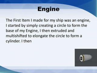 The document describes the initial steps taken to create an engine part for a ship model by first forming a circular base that was then extruded and manipulated to form an elongated cylindrical shape. Further details are not provided about additional engine features or the ship model.