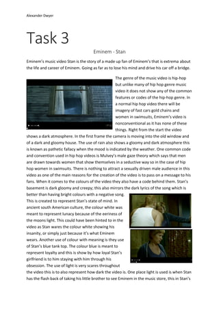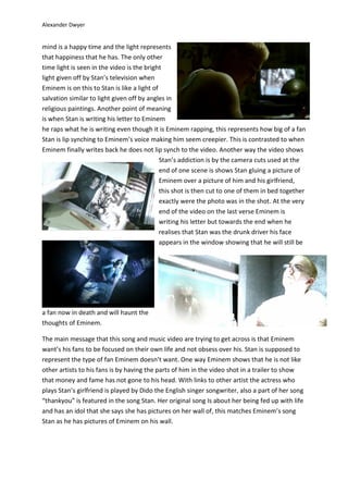 The music video for Eminem's "Stan" tells the story of an obsessive fan of Eminem's who loses his mind and drives off a bridge. Though a hip-hop song, the video has a dark tone and does not feature typical hip-hop imagery. Symbolism is used throughout, like Stan wearing white to represent insanity. The video aims to warn fans against obsession and shows Eminem does not want fans to define themselves by his fame.