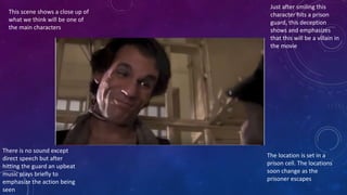 This document analyzes the conventions of an opening movie sequence. It summarizes several scenes: 1) A close-up of a main character in a prison cell who hits a guard before escaping to an upbeat music cue. 2) A character in a house sees a car chase out the window, though at first thinks it's from the TV. 3) Another main character is introduced at a dock as the car chase continues throughout the city. The purpose is to introduce characters and set the scene for a dramatic car chase escape.