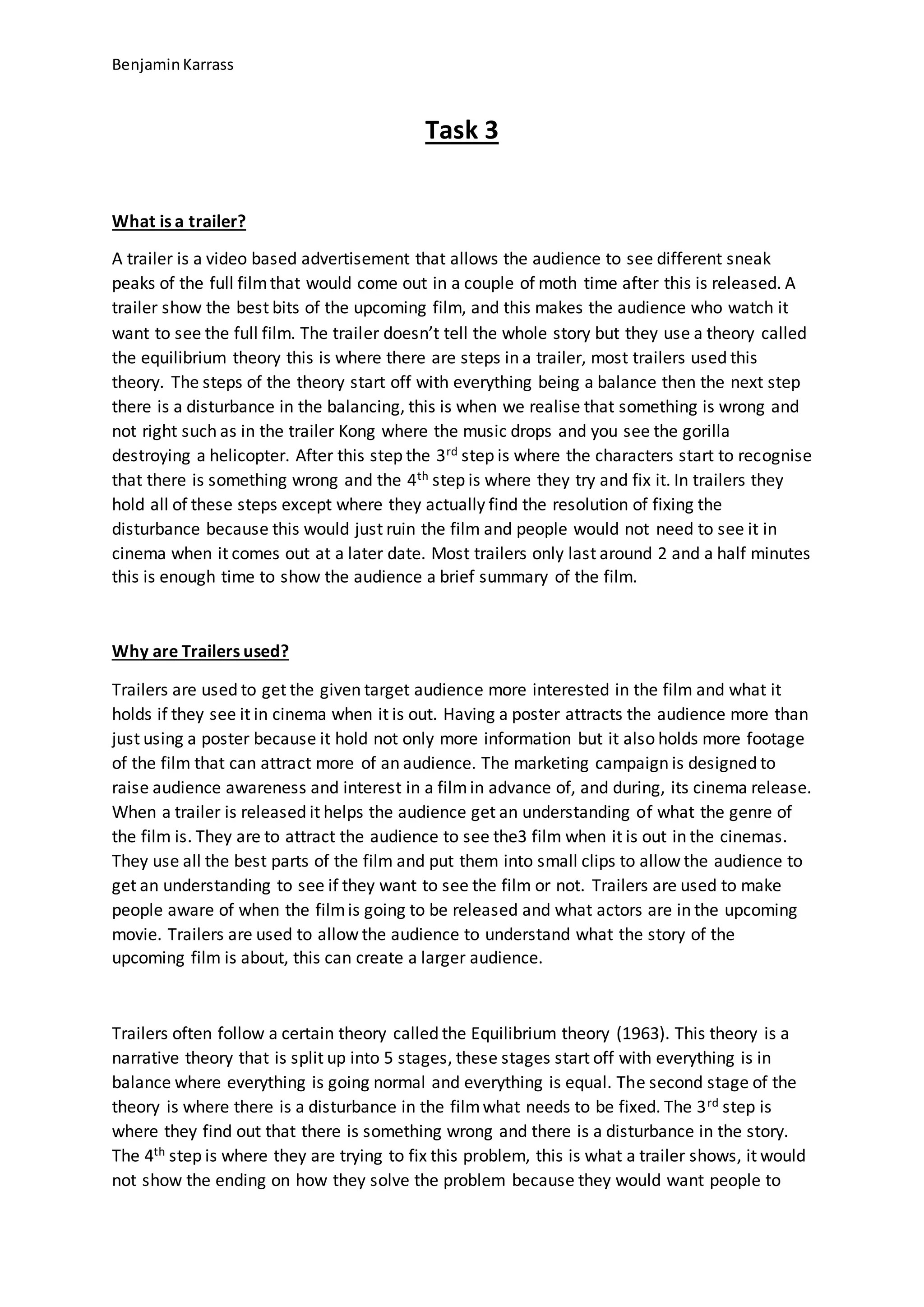 A trailer is a short video advertisement that provides sneak peaks of an upcoming film to generate interest. Trailers aim to show the best parts of the film in 2-3 minutes to entice audiences to see the full movie. Trailers follow a narrative theory called the "equilibrium theory" where there is initially a balance that is disrupted, characters recognize the disturbance, and try to fix it (though trailers do not show the actual resolution). Company logos and identifiable titles are included to establish the producers and genre. Music and sounds are carefully selected to set the mood and build tension, often changing when something unexpected occurs. The goal is to attract audiences and create intrigue around the story without revealing the entire plot.