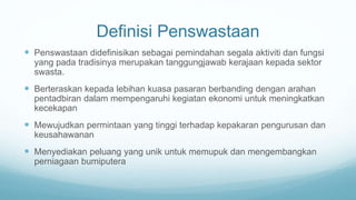 Dokumen membincangkan penswastaan sebagai pemindahan tanggungjawab kerajaan kepada sektor swasta untuk meningkatkan kecekapan dan permintaan terhadap pengurusan. Ia mencadangkan kerjasama antara majlis perbandaran dan pihak swasta untuk membiayai projek menaik taraf stesen keretapi dengan memanfaatkan tanah di sekelilingnya. Kesimpulannya, penswastaan dapat menyediakan perkhidmatan yang lebih cekap dan menyokong pertumbuhan ekonomi.