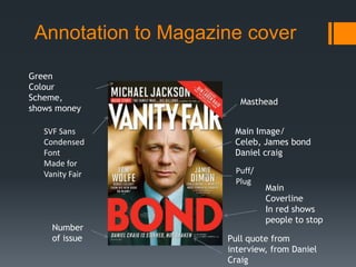 3) Placement of cover lines and stories emphasizes Bond as the main attraction without distracting from other important pieces like one on Michael Jackson.