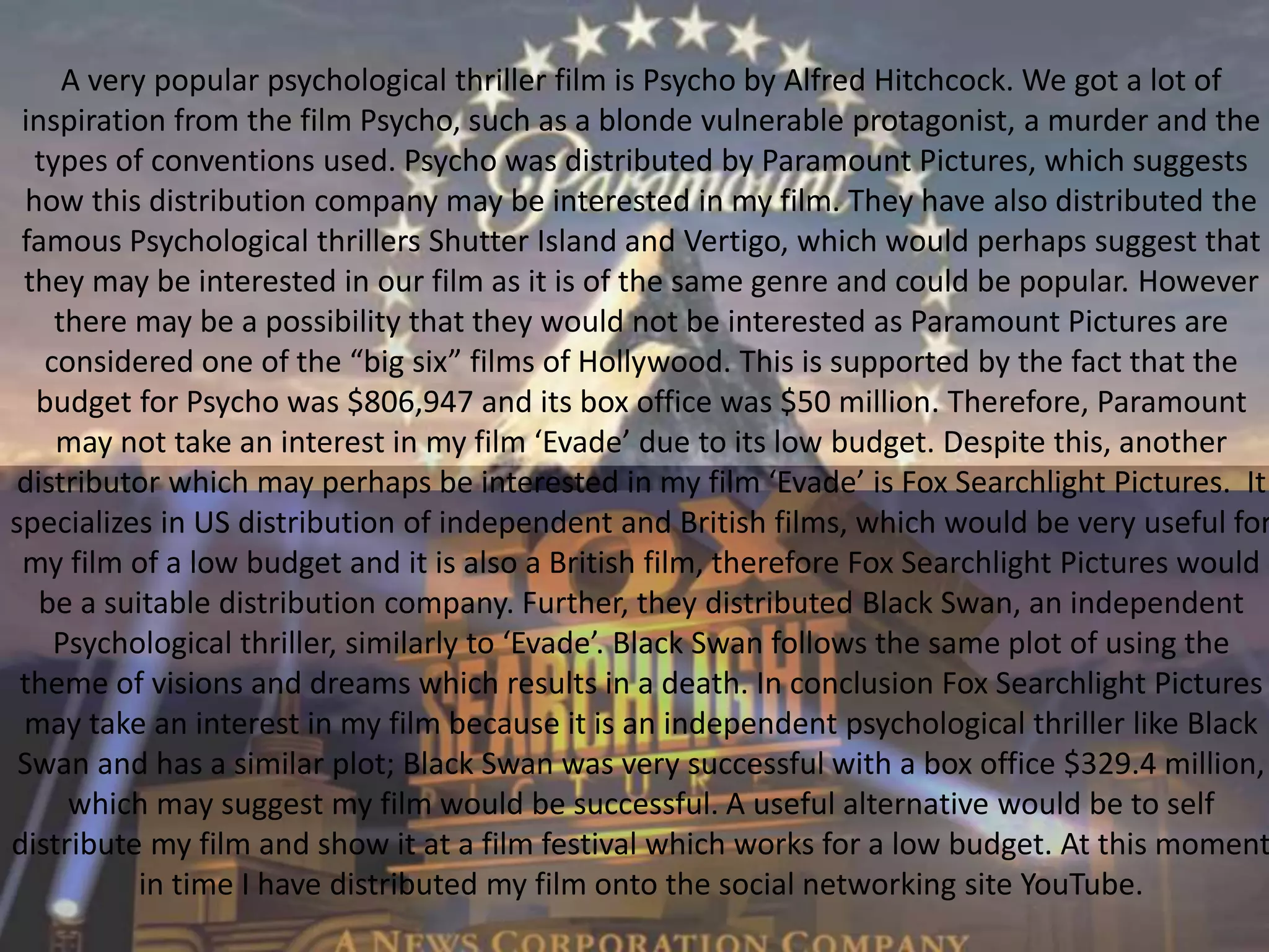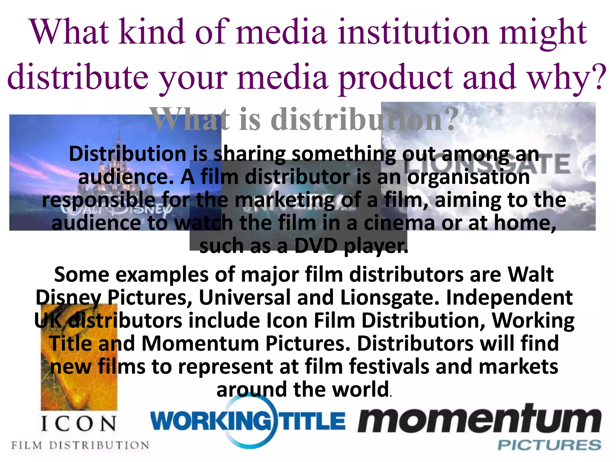 Distribution involves sharing a media product with an audience through various platforms. Major film distributors like Paramount Pictures distribute films in theaters, through DVD/Blu-Ray, and on streaming platforms like Netflix. They market films through trailers on YouTube and TV ads. Independent distributors may rely more on online platforms. The document discusses how the psychological thriller film "Evade" could potentially be distributed by Paramount Pictures or Fox Searchlight Pictures due to their experience distributing similar independent or British films.
