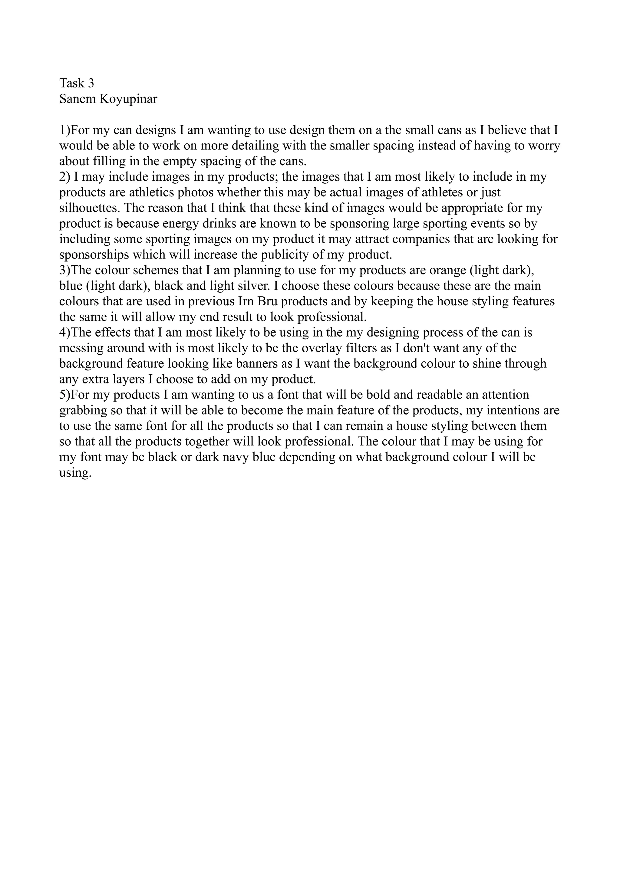 3) The designer will use orange, blue, black, and light silver color schemes, which are typical of existing Irn Bru products, to maintain a professional house style across products.