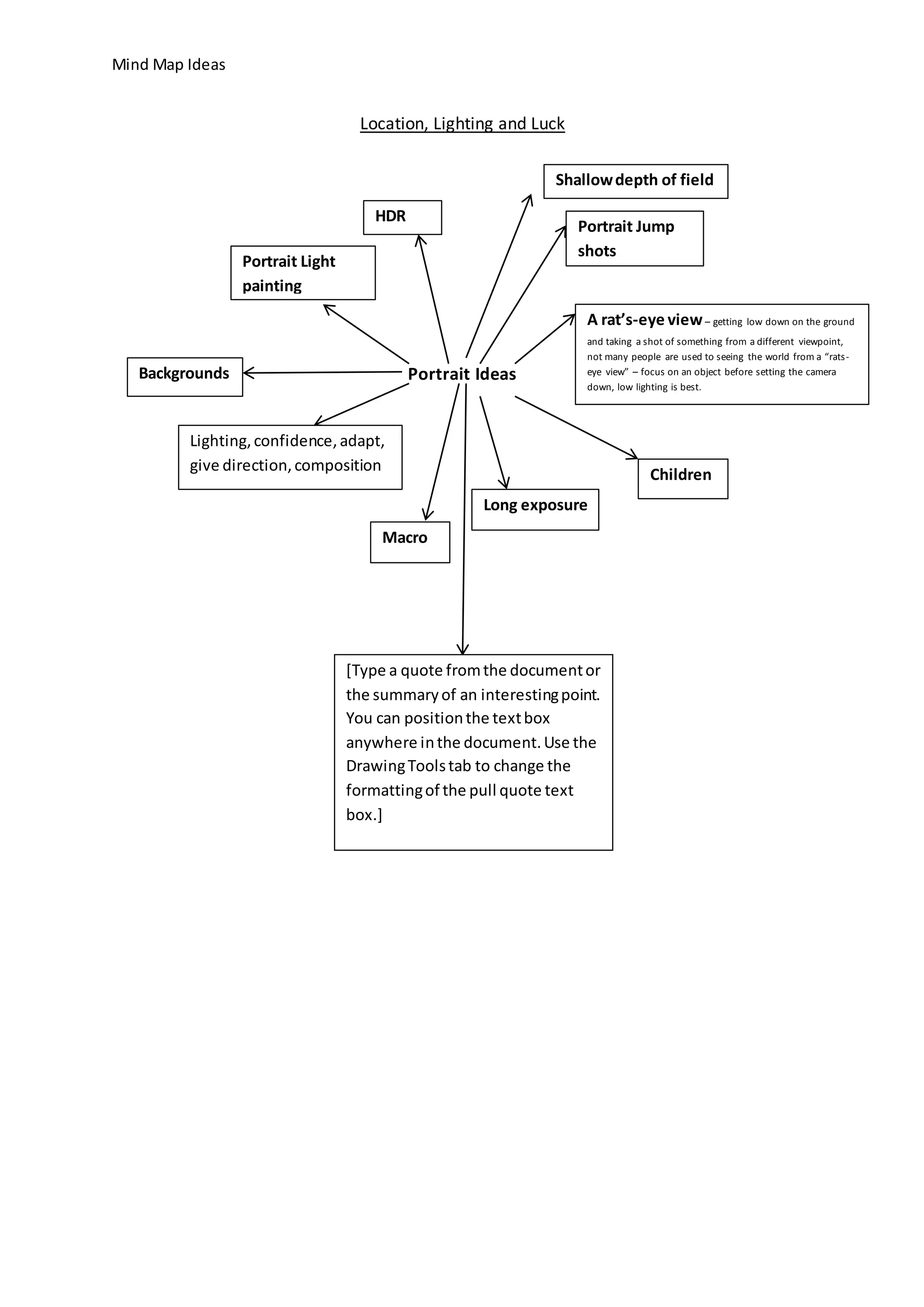 The document provides ideas for taking portrait photos including getting low to the ground for a unique perspective, focusing on the subject before lowering the camera, and using low lighting which works best. It also lists other portrait photo techniques such as long exposures, macro shots, considering the background, and using a shallow depth of field. Confidence, adapting to the situation, giving direction, and strong composition are important when taking portraits.
