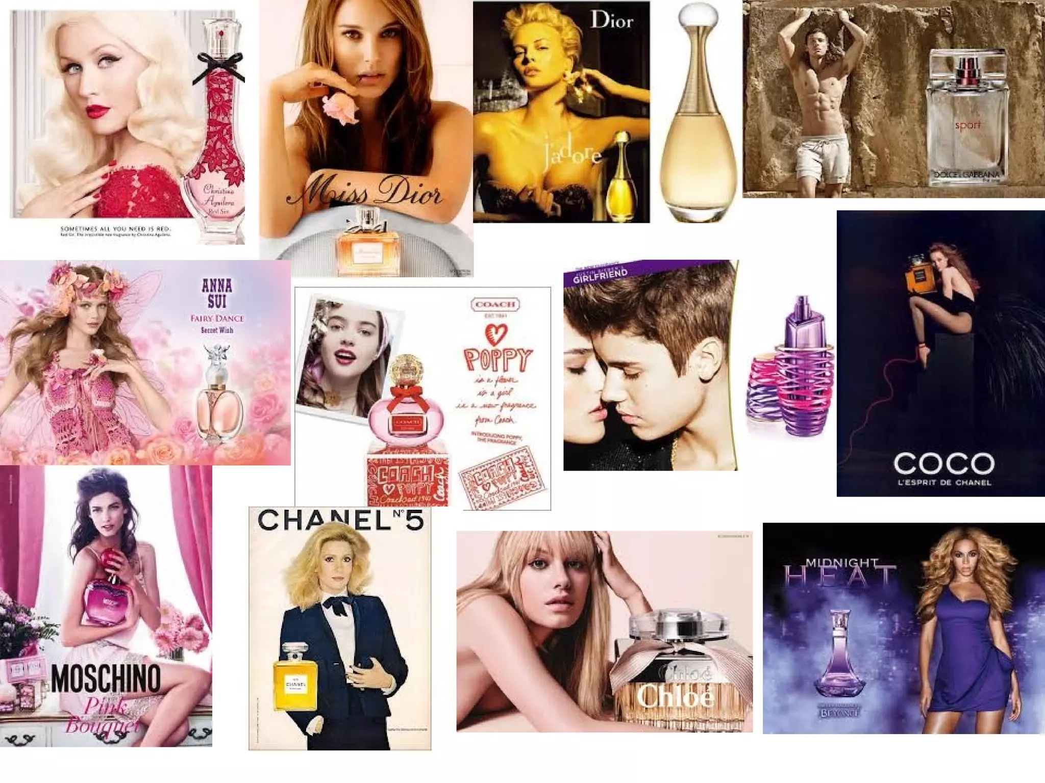 The document describes two perfume advertisements. The first targets young women with a purple and bold typography advertising a Beyoncé perfume called "Midnight Heat" showing her in a purple dress in New York City at night. The second targets professional women with a black and white business-like style advertising an expensive yellow perfume bottle, showing a woman relaxing in a posh yellow living room. Both aim to portray luxurious lifestyles and attract romantic partners through their scents.