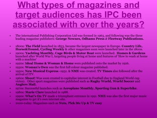 IPC has been associated with publishing magazines targeting a wide range of audiences over the years. In the 1800s, they published magazines related to fields, horses, cycling, and other interests. In the 1900s, they launched magazines about yachting, birds, and boats. Throughout the 1900s and 2000s, they published magazines in many genres including homes, women's interests, music, TV, sports, hobbies and more. As a large publisher with experience in various genres, IPC would be well-suited to publish a new music magazine. They could target a unique music genre or broad audience. Alternative publishers like Bauer may also be appropriate as they own over 300 magazines across many countries and platforms.
