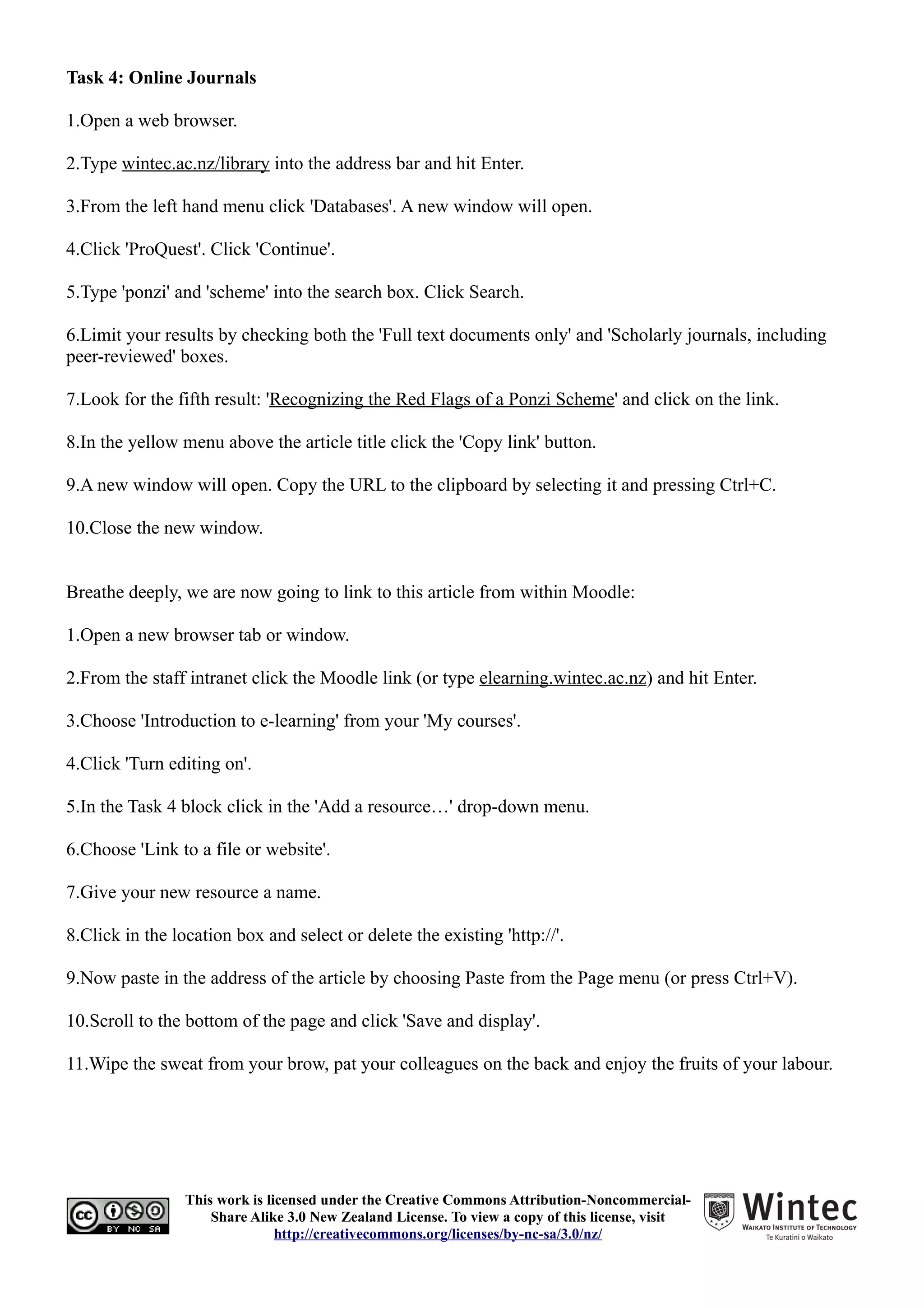 The document provides instructions for finding an article about memristors in the New Scientist journal using the ScienceDirect database. It then gives directions for linking to the article's DOI from within a Moodle course page in order to add it as a resource. The steps involve searching for the article, copying its DOI, pasting the DOI into the location box when adding a new link resource in Moodle, and saving the link.