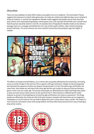 This document discusses the debate around censorship and its potential benefits and drawbacks. It notes that censorship aims to protect individuals like children from inappropriate or harmful content. However, censorship may also infringe on privacy and freedom of expression. The effects of media consumption are also debated, with some arguing it can influence behaviors while others say direct effects are unclear. The document examines different views around what content should and should not be censored, as well as debates around who should make decisions about what children access.