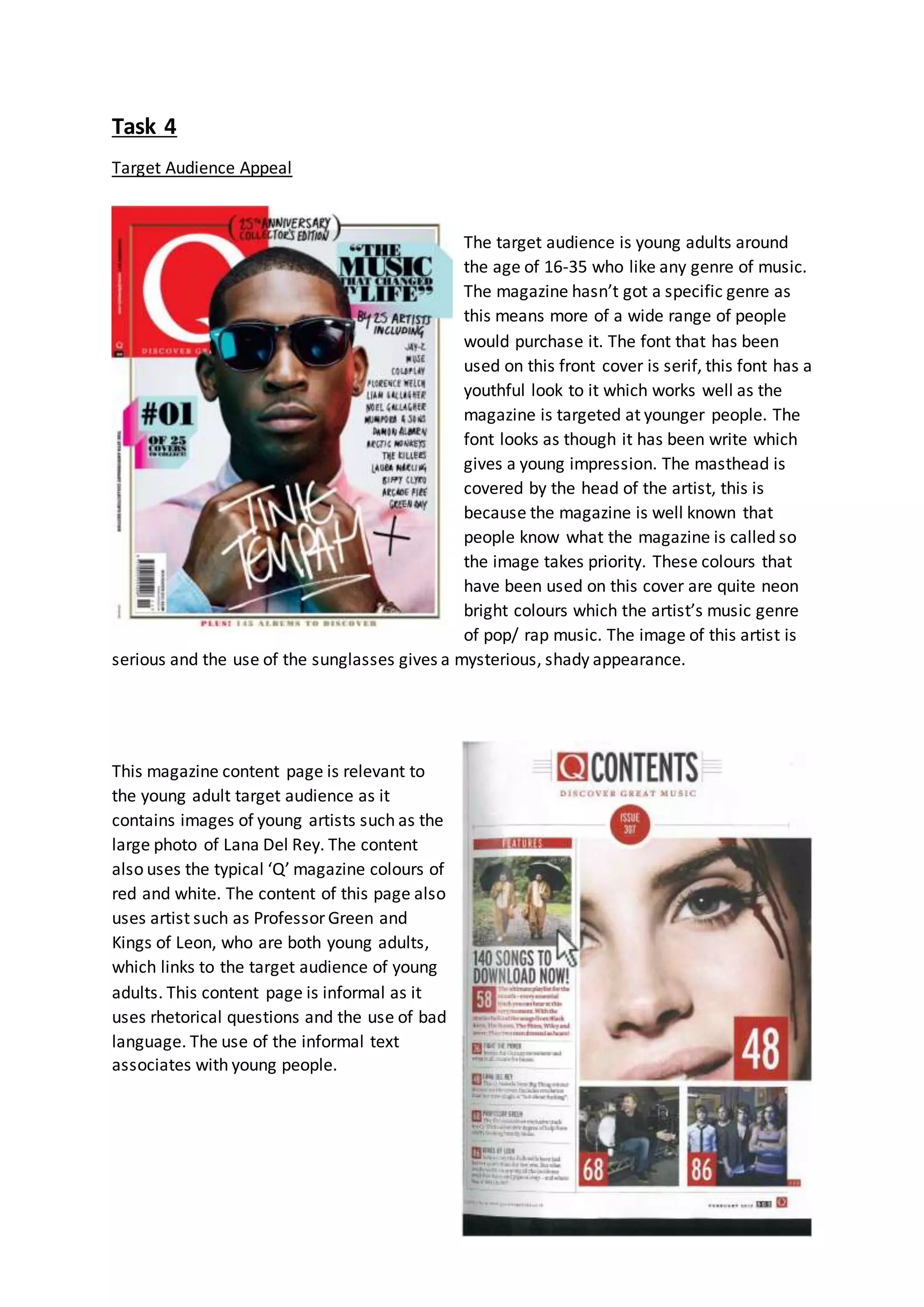 This document discusses the target audience of a music magazine. The target audience is young adults aged 16-35 who enjoy any genre of music. A serif font is used that has a youthful look to appeal to younger readers. Artists featured on the cover and in articles are typically young to match the target demographic. Bright colors and informal language are also used throughout the magazine to appeal to its young adult audience.