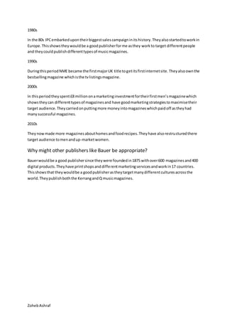 During the 1800s-1900s, IPC magazine targeted mainly men but also included content about gardening and leisure activities. They offered prizes to readers to increase sales. By the 1920s, IPC started targeting women and veterans to discuss relevant topics. They continued launching new magazines in varied genres through the subsequent decades to match trends and remain competitive. IPC demonstrated flexibility in their long publishing history by adapting their magazine offerings around popular music, sports, hobbies and other topics over 100+ years, showing they would make a suitable publisher.
