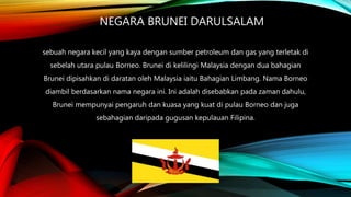 Negara Brunei Darussalam adalah negara kecil yang kaya dengan sumber petroleum dan gas di Pulau Borneo. Negara ini mengekalkan amalan-amalan baik seperti mempertahankan hukum-hukum Islam, mengukuhkan hubungan antarabangsa, dan meningkatkan integriti kalangan pegawai awam. Di daerah Kulai, Johor, masyarakat mengekalkan tradisi seperti gotong-royong dan menyediakan kemudahan asas untuk rakyat.