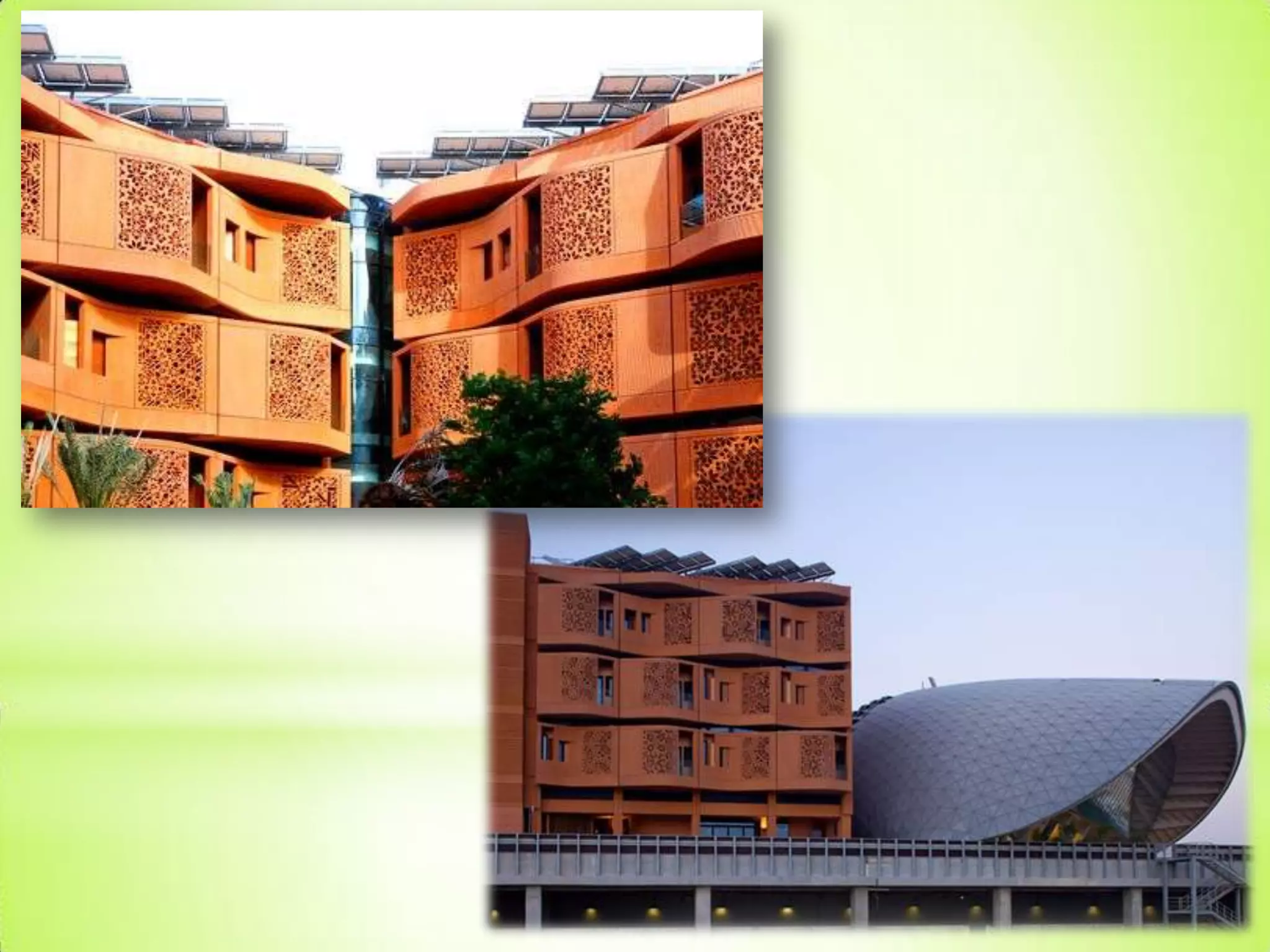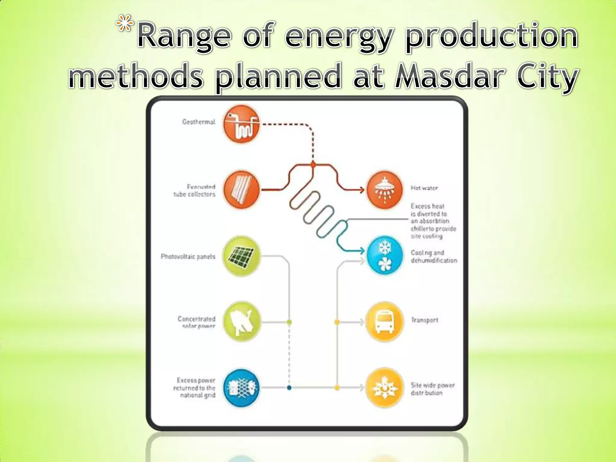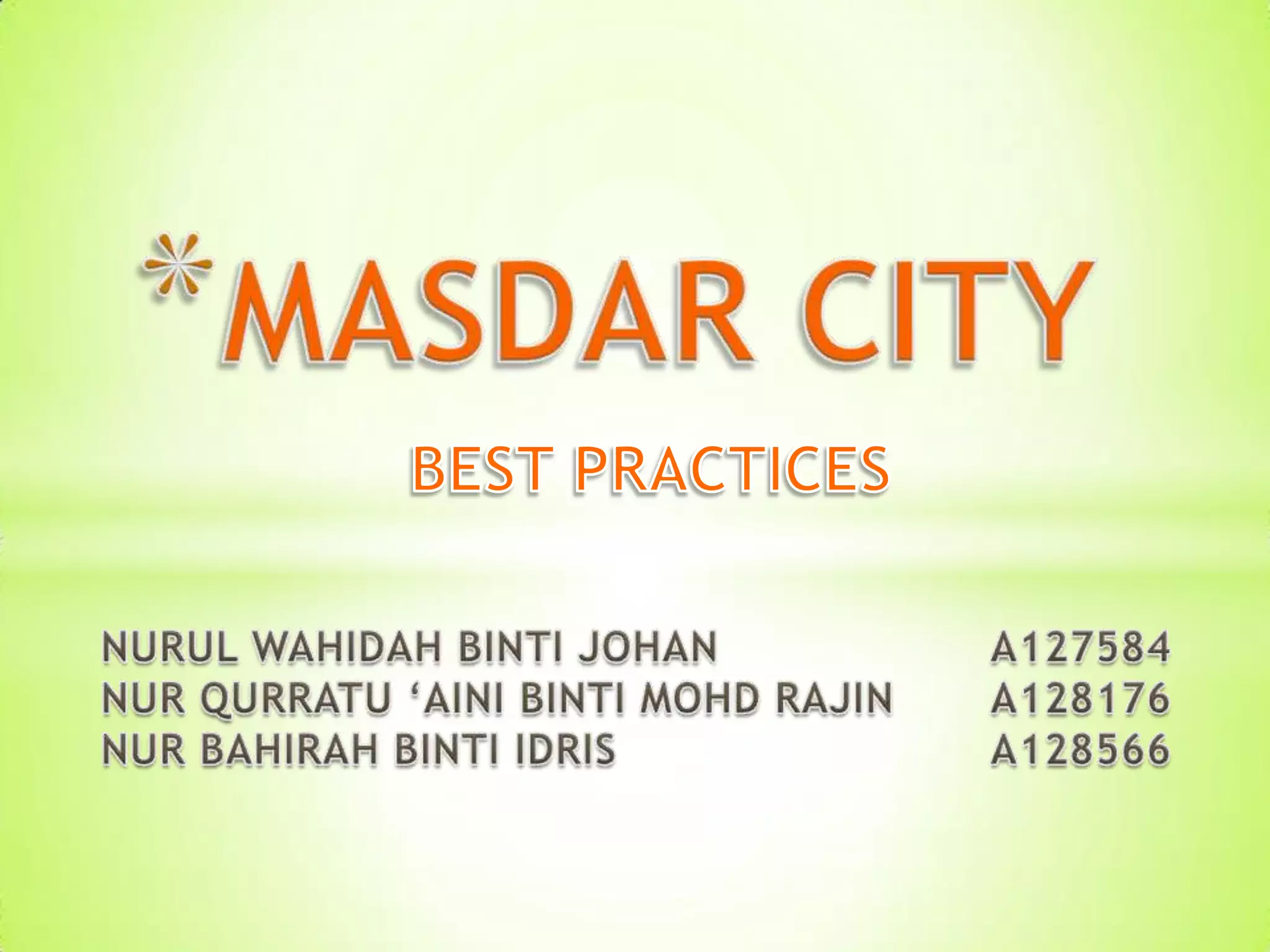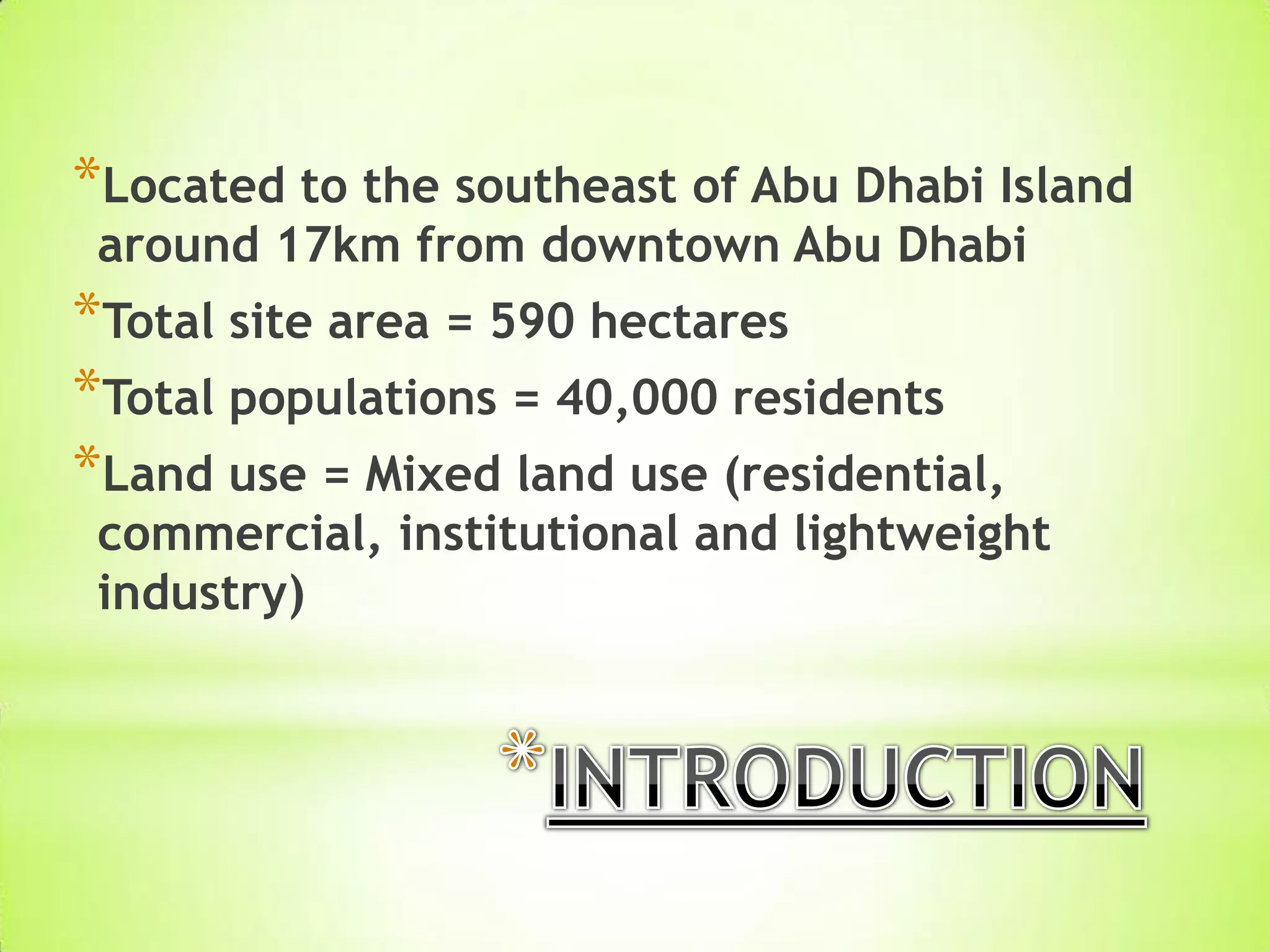Masdar City is a planned city located 17km from downtown Abu Dhabi covering 590 hectares with a planned population of 40,000 residents. It was established in 2007 by Masdar as a model of urban sustainability and has received several awards for its sustainable design and development. The city aims to achieve sustainability through its master plan which focuses on synergy, mobility, energy efficiency and quality of life.