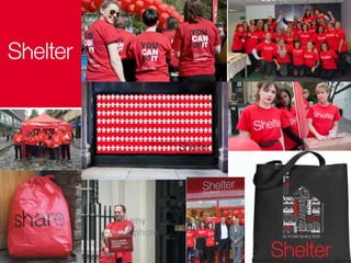 Shelter is a registered charity that provides housing advice, support, and campaigns to end homelessness in England, Scotland, Wales, and Northern Ireland. It was founded in 1966 in response to overcrowded housing conditions and helps millions of people annually who are struggling with housing or homelessness. While Shelter has achieved successes such as influencing legislation protecting tenants and the homeless, it continues to campaign for more affordable housing and to help the estimated 100,000 homeless children in the UK. Shelter relies on support from partners and donors to fund its services to those in need of housing assistance.