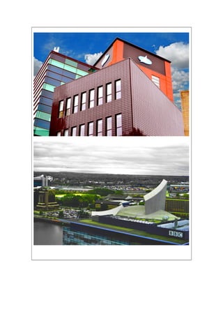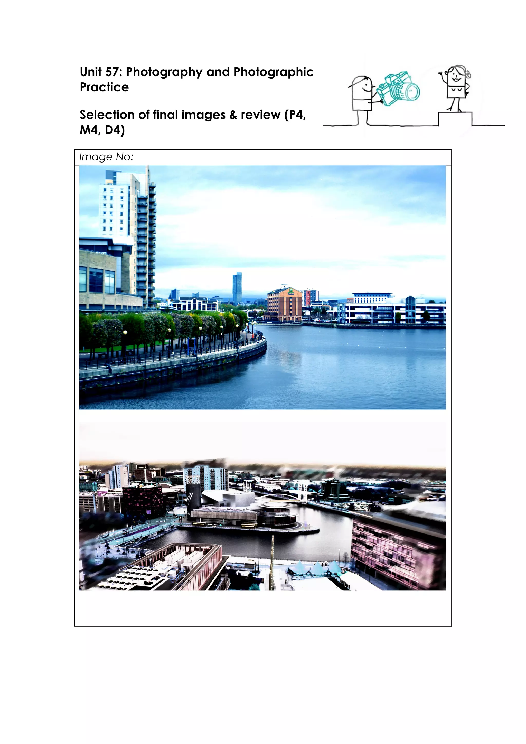 The student took photos around Salford Quays focusing on the natural areas that are often overlooked. One photo showed a graveyard behind Media City to show an unseen part of the area. The student received feedback that some photos lost the theme, and could have used higher ISO settings since some photos were blurry or over-edited trying for a futuristic look. Strengths included varied angles and heights showing different views, while weaknesses were over-editing photos and blurriness from long shutter speeds without focus. The student aims to improve focus and avoid over-editing in the future.