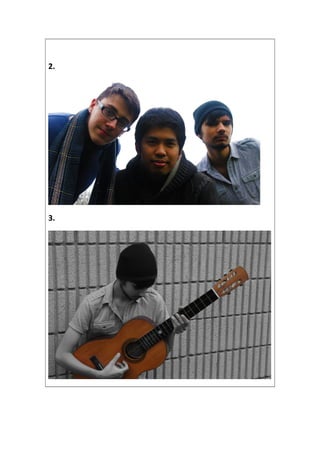 The photographer took a series of 10 photos of a band for a music magazine. For each photo, they described the theme and reasoning for choices in composition, posing, and editing. Common techniques included using the rule of thirds, varying expressions, and cropping for focus. The photographer was generally satisfied but felt some photos could be improved with different editing or locations.