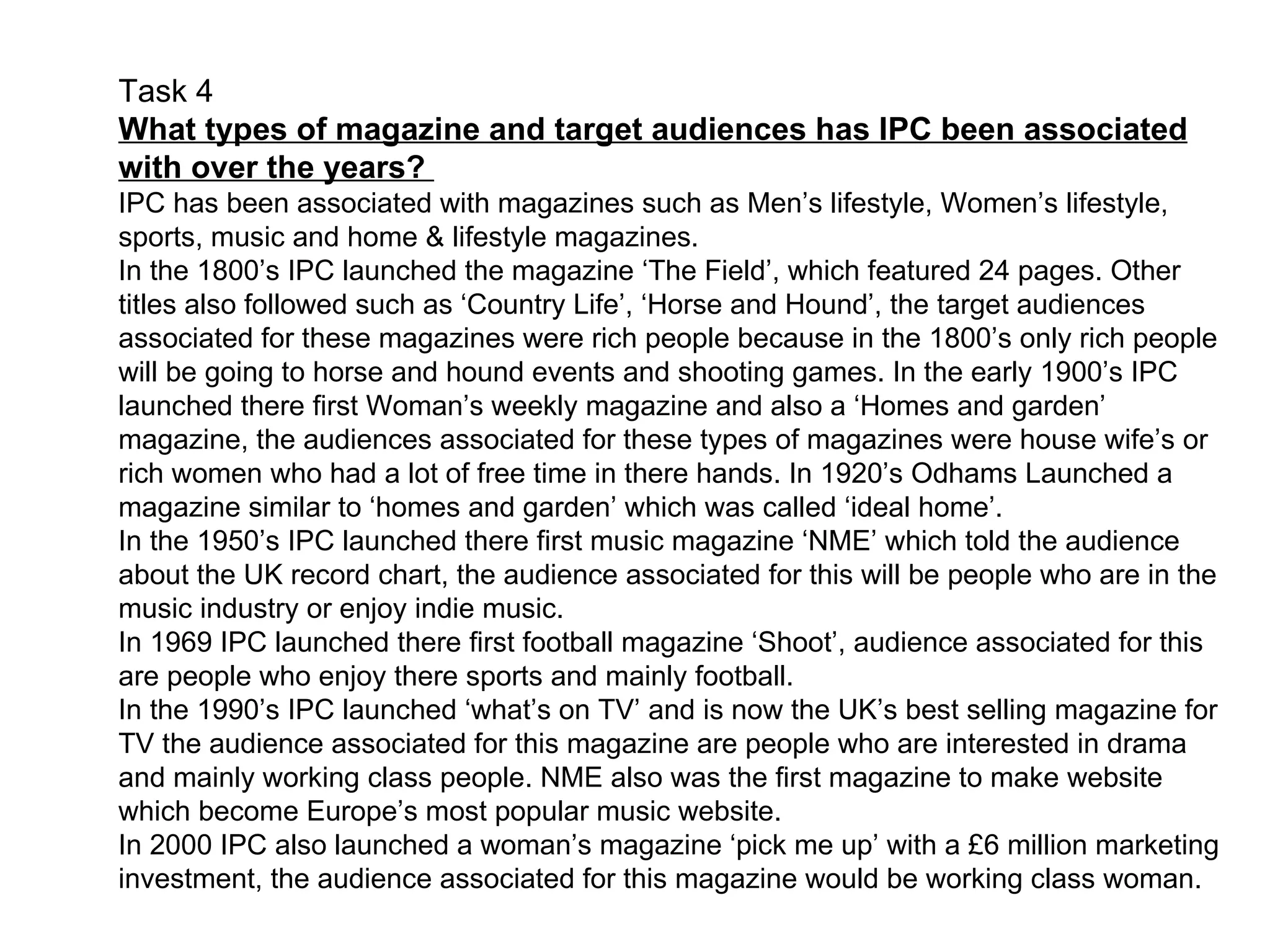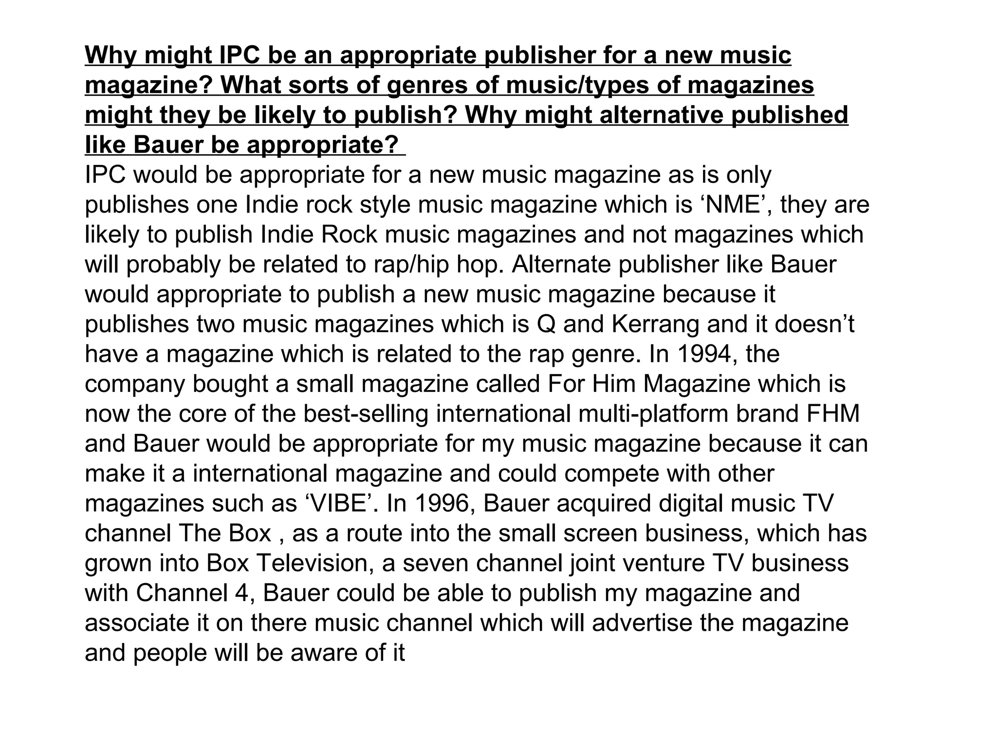 IPC has published magazines targeting various audiences over the years, including magazines focused on men's lifestyle, women's lifestyle, sports, music, and home & lifestyle. In the 1800s, their magazines targeted wealthy audiences. In the early 1900s, they launched women's magazines targeting housewives and wealthy women. They launched their first music magazine called NME in the 1950s, targeting people in the music industry and fans of indie music. In 1969 they launched a football magazine targeting sports fans. They would be a suitable publisher for a new indie/rock music magazine as they only publish one such magazine currently, NME. An alternative like Bauer would also be suitable as they publish magazines across different music genres like rap.