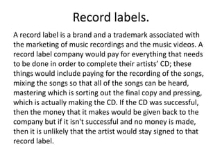 The document discusses record labels and copyright. It explains that record labels are responsible for financing, producing, and promoting artists' music and videos. There are two types of labels - major labels that are owned by large conglomerates and can promote artists widely, and independent labels that work with smaller, local artists and have smaller budgets. The document also outlines what copyright is and that record labels own the copyright to songs by the artists they sign. It notes some dos and don'ts for using copyrighted music in one's own videos, such as not copying an existing video and only using music for private, non-commercial use or with permission.