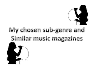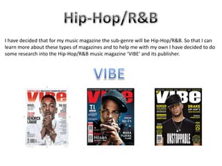 The document discusses the author's plans for creating a new music magazine focused on hip-hop and R&B. The author has decided to research the magazine "VIBE" as a model to help inform their own magazine. While liking VIBE's style and layout, the author does not want to partner with its current publisher as it may take away from VIBE's sales. Instead, the author is considering Bauer Media as they have successfully published other music magazines in different genres. The author's new magazine will be called "Track" to reflect its focus on hip-hop music.