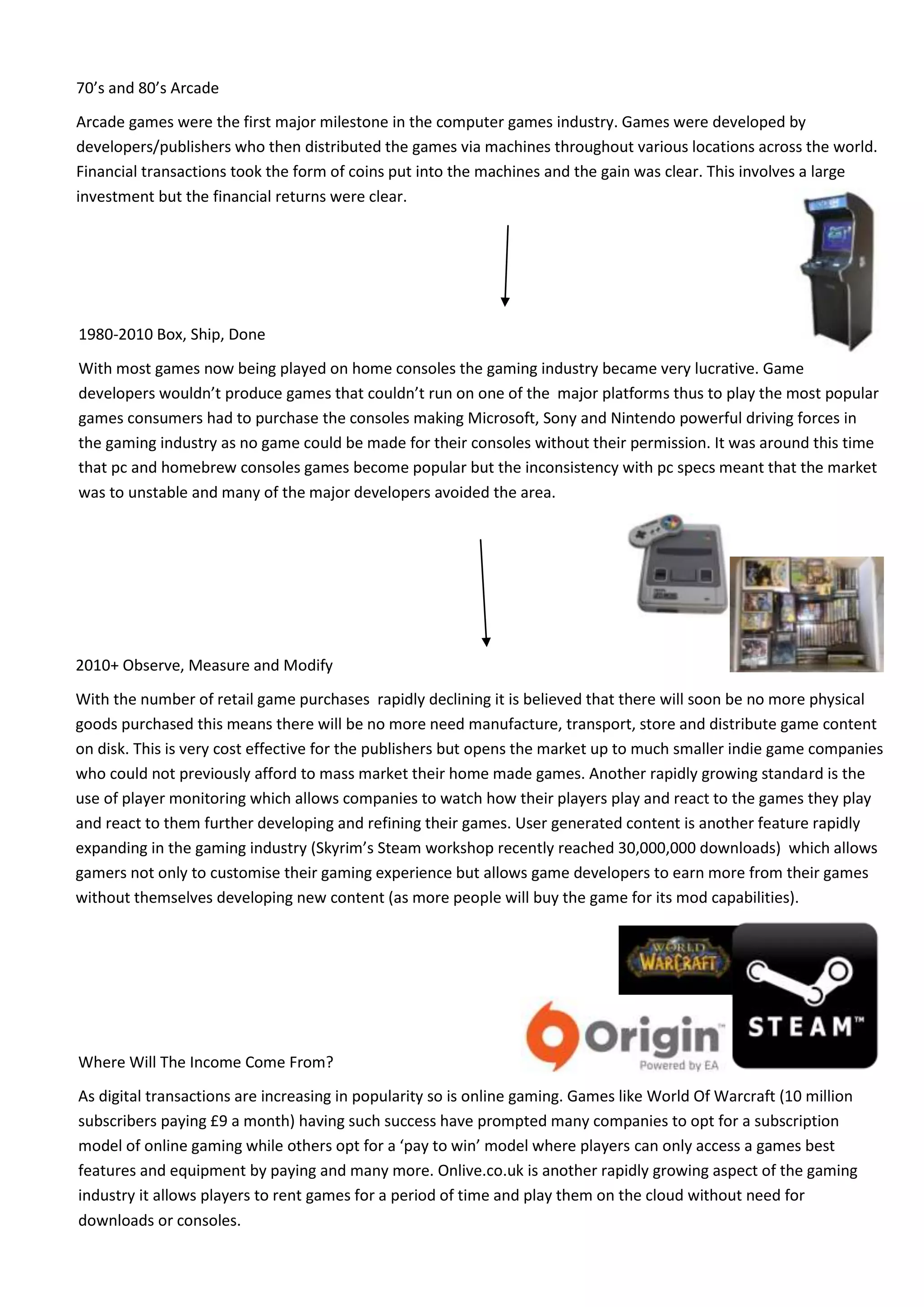 Arcade games in the 70s and 80s were the first major milestone in the computer games industry. Games were developed by publishers and distributed in arcades around the world, where financial returns came from coins inserted into the machines. In the 1980-2010 period, games were mostly played on home consoles, making console makers powerful forces as games had to be approved to be made for their platforms. Now in the 2010+ era, physical game sales are declining and digital distribution is rising, lowering barriers for indie developers while allowing user monitoring and customization through mods.