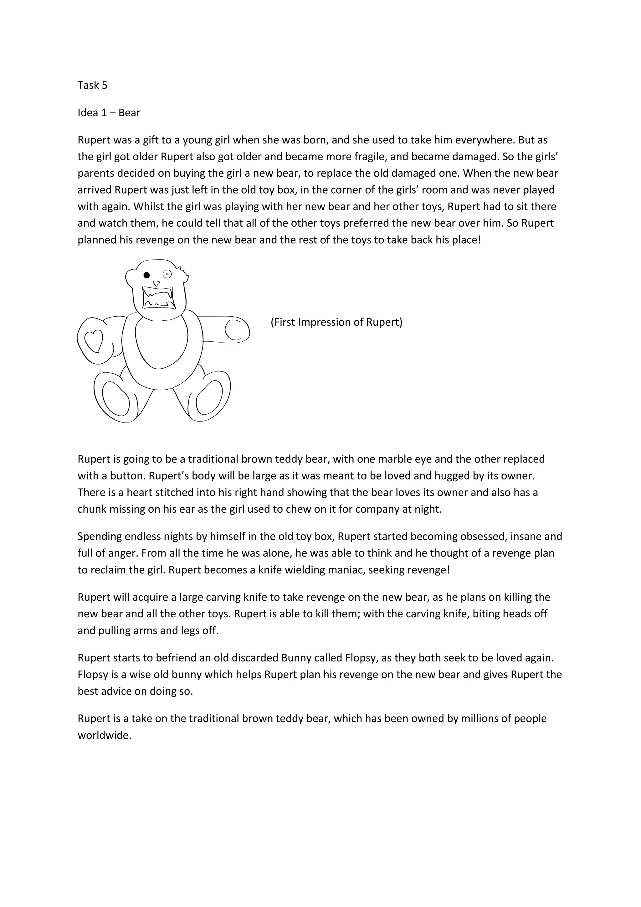 Rupert was a gift given to a young girl, but as she grew older he became damaged and was replaced by a new bear. Left in the toy box, Rupert grew angry and planned his revenge. He acquires a large knife and seeks to kill the new bear and other toys, becoming insane from his time alone. Rupert befriends an old discarded bunny named Flopsy, who helps him plan his revenge to be loved again.