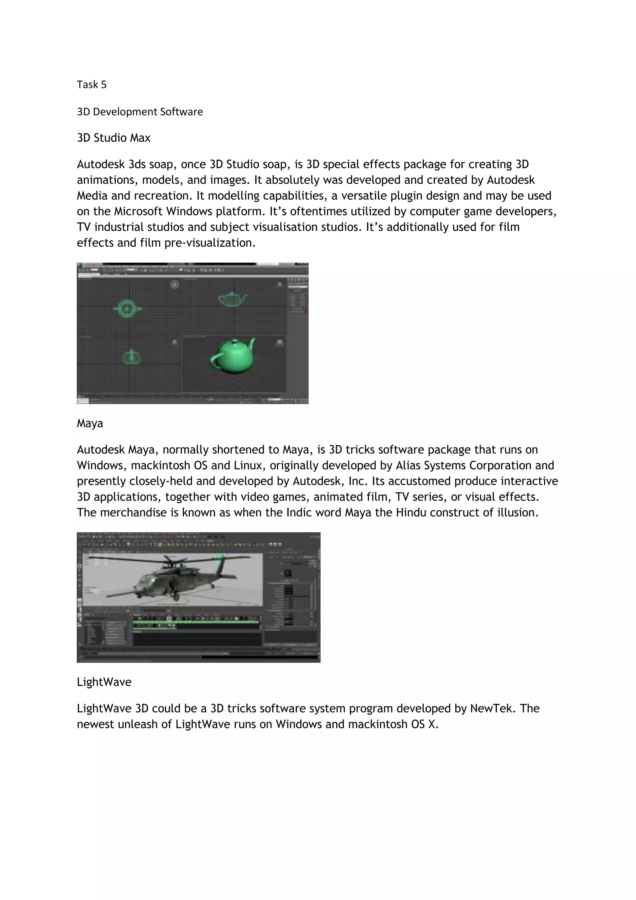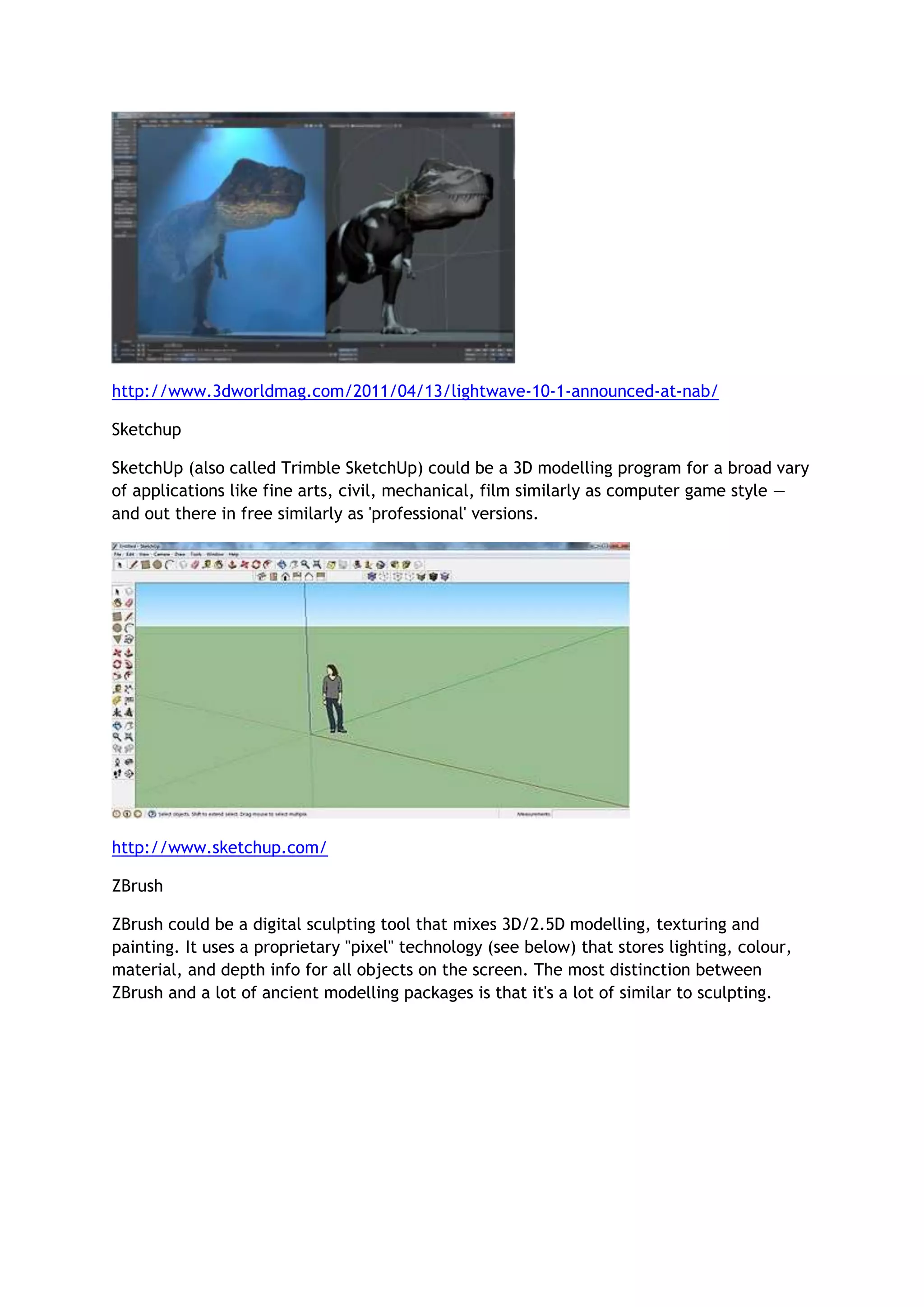 3D Studio Max is 3D animation and modeling software developed by Autodesk that allows for 3D modeling, plugins, and images. It is commonly used in game development, visual effects, and architectural visualization. Maya is also a 3D animation and visual effects software by Autodesk used for games, films, and visual effects. It was originally created by Alias Systems. LightWave is a 3D animation software developed by NewTek that runs on Windows and Mac and is used for visual effects. SketchUp is a 3D modeling program for art, engineering, films, and games available in free and professional versions. ZBrush is a digital sculpting tool that combines modeling, texturing, and painting using a