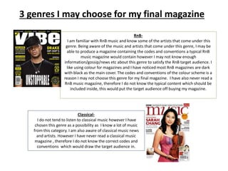 The document discusses potential genres that could be chosen for a magazine: R&B, classical, and pop. Pop is selected as the genre because the author is most familiar with pop music, artists, news, and magazines in that genre. Potential masthead names are also discussed: Harmonise, Fusion, Melody, Chorus, Fantasia. Research is done on existing pop music magazines like Billboard and We Love Pop to analyze layout, design, and content. Different article styles are also examined including a Q&A, behind the scenes, and what's hot this week format. At the end, a question will be included in a questionnaire to get others' opinions on the masthead name.