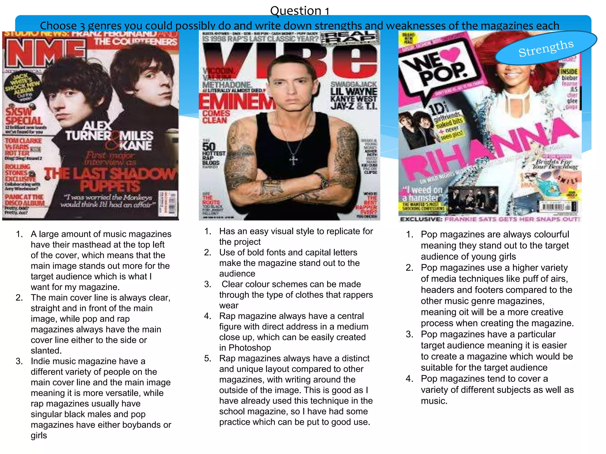 The document discusses the strengths and weaknesses of different music magazine genres - rap, indie, and pop - for a school magazine project.
