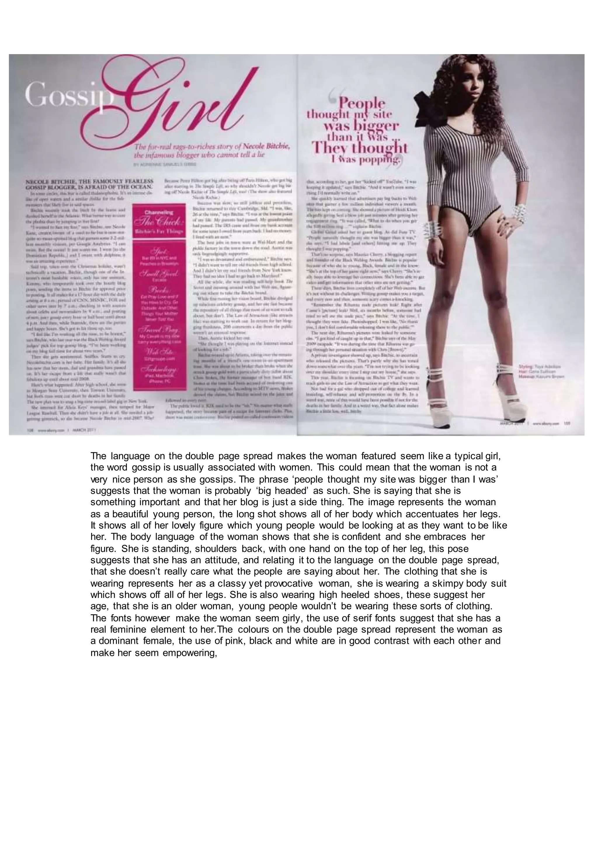 The document analyzes and makes assumptions about a woman featured on a double page spread. It suggests that she seems confident based on her body language and pose, embracing her figure in a skimpy bodysuit and high heels. While the fonts used give her a girly feel, the contrasting colors of pink, black and white make her seem like an empowered yet provocative woman.