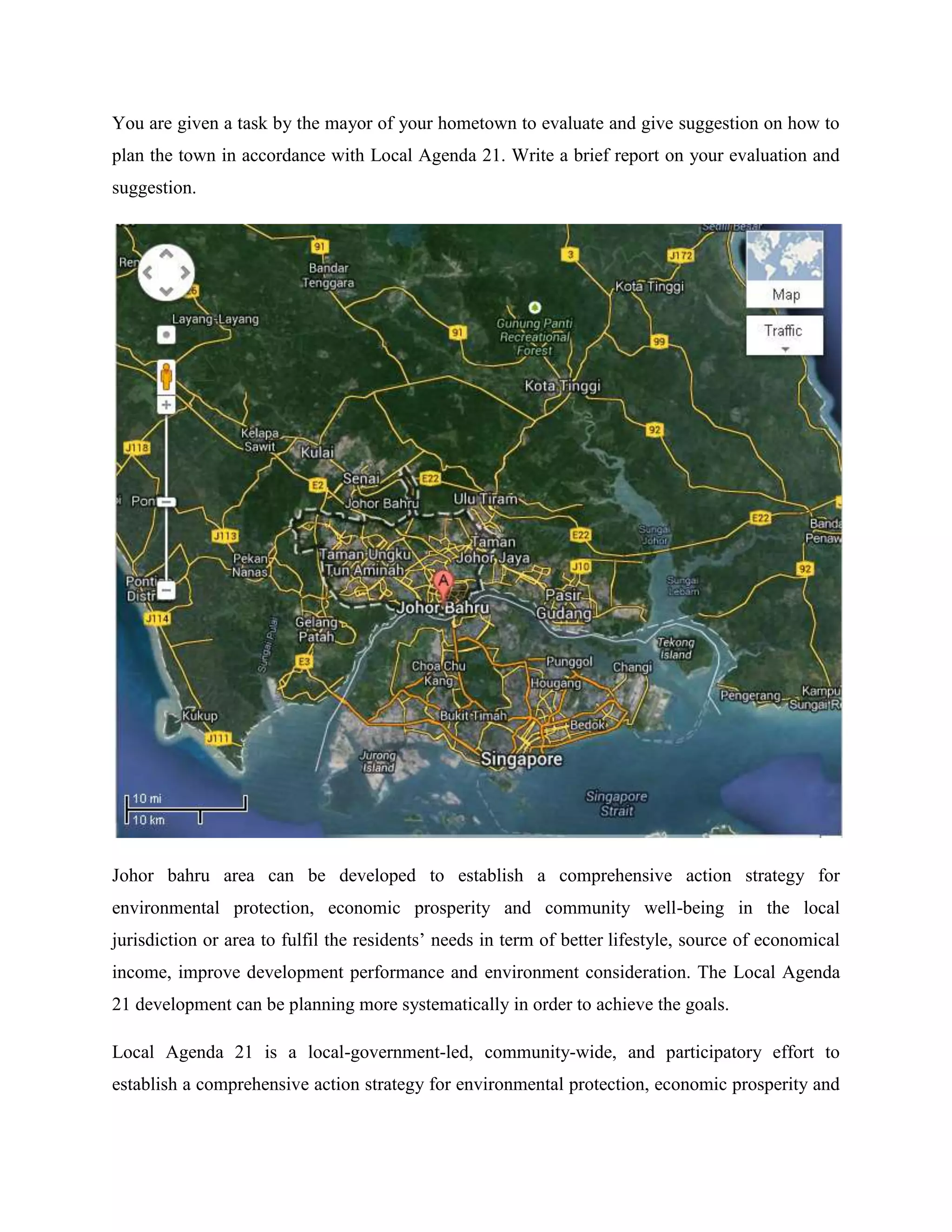 The document outlines a report evaluating and providing suggestions for implementing Local Agenda 21 in Johor Bahru, Malaysia to improve environmental protection, economic prosperity, and community well-being. It analyzes the six key elements of Local Agenda 21 and provides recommendations. Suggestions include establishing partnerships between residents, private organizations, and local authorities, integrating sustainable development into policies, raising public awareness through education campaigns, and regularly monitoring progress towards sustainability goals.