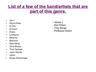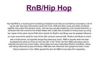 RnB/Hip Hop is a genre that blends elements of RnB, hip hop, funk, disco and jazz. It originated from DJ Kool Herc mixing songs using two copies of the same record. RnB, which stands for Rhythm and Blues, had its origins in blues and jazz and influenced various 20th century music styles like rock and roll. Popular artists in the genre include Jay-Z, Kanye West, Dr. Dre, Eminem, Drake and Lil Wayne.