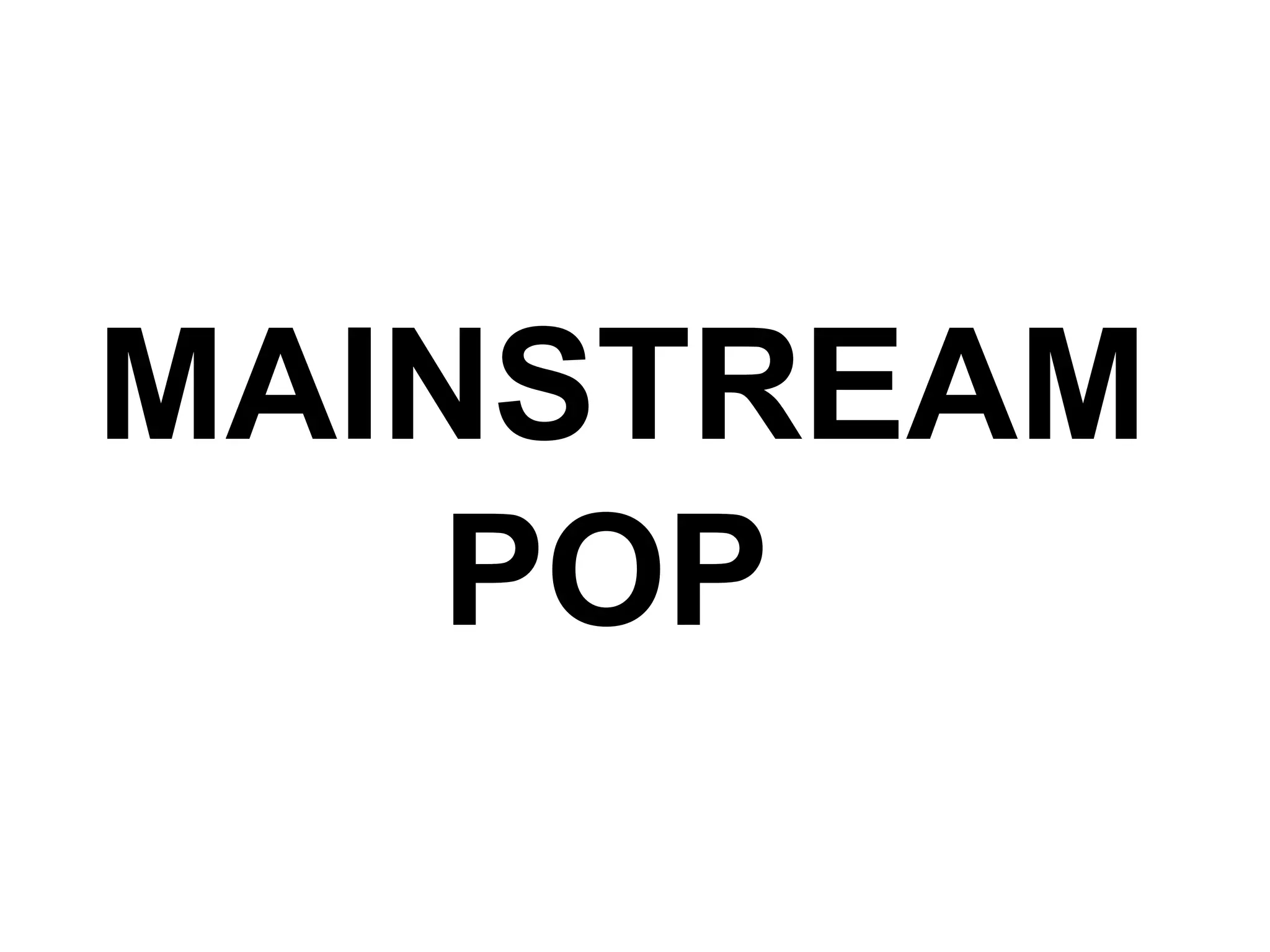 This document provides a brief history and overview of mainstream pop music. It lists popular mainstream pop artists from 2000s-2010s and notes that the term "pop music" originated in 1926 to describe commercially recorded music meant to appeal to general audiences rather than a particular ideology. The document explains that pop music consists of short, simple love songs with catchy choruses and originated in Britain in the 1950s with artists like The Beatles and ABBA. It also discusses how television and visual elements helped pop stars gain popularity starting in the 1950s and how pop music has incorporated styles from other genres over time.