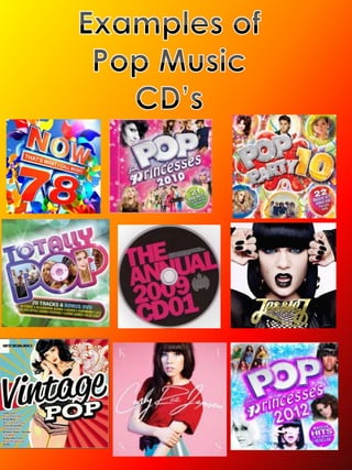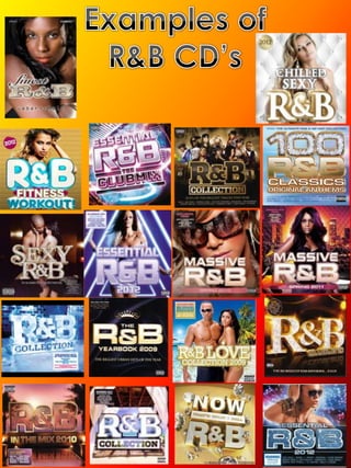 R&B/Pop music are popular genres featured in the magazine. R&B originated in the 1940s and evolved to incorporate electric blues, gospel and soul music. It is now a combination of rhythm and blues, pop, soul, funk and hip hop. Associated imagery includes hot weather and palm trees. Pop music originated in the 1950s and borrows from various styles, with catchy melodies and choruses. It aims to be commercially appealing. Both genres have upbeat themes and are popular among diverse audiences from ages 12 to 30.