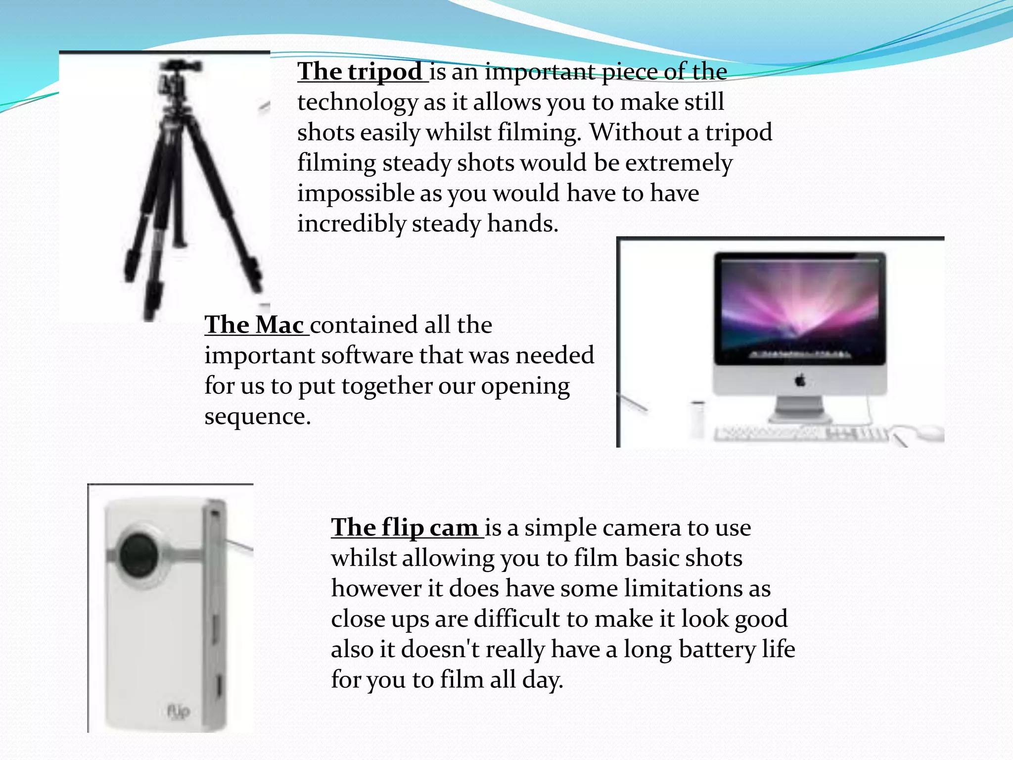 The document discusses various tools and techniques used to create an opening film sequence. It mentions that a tripod allows for steady shots when filming and that the Mac contains software like Final Cut for editing shots in order and adding soundtracks. Other tools referenced include a basic flip cam for filming but its limitations for closeups, and presentation apps like Slideshare and Prezi. Mahara is identified as the journal used to share work in progress.