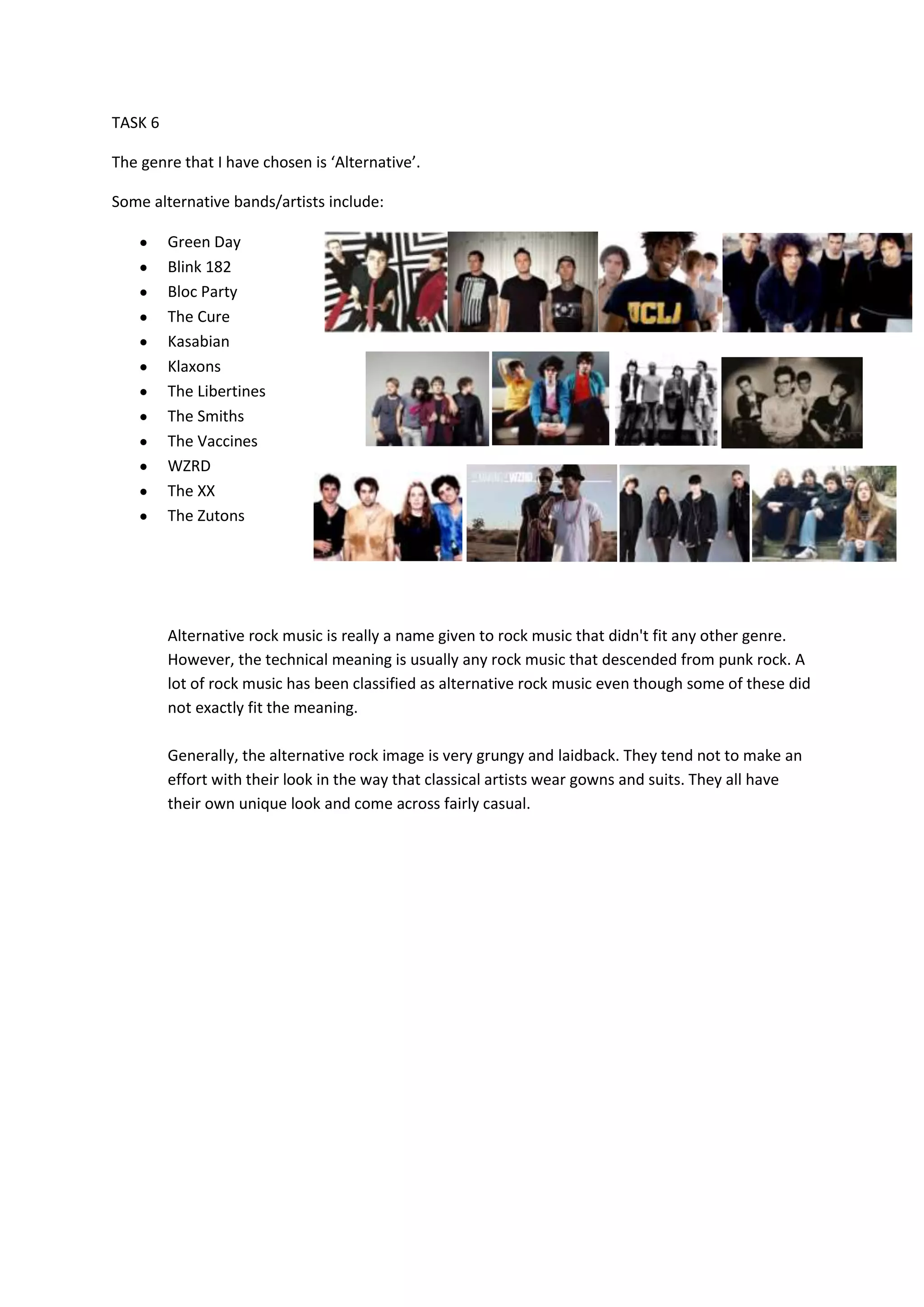 Alternative rock music is a genre that includes bands such as Green Day, Blink 182, and The Cure. It is a style of rock music that does not fit into other genres, often descending from punk rock. Bands in this genre have a generally grungy and laidback image, differing from classical artists who wear formal attire, as alternative artists have their own unique and casual styles.