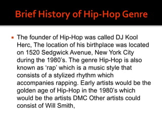 DJ Kool Herc is considered the founder of hip-hop. He was born in 1520 Sedgwick Avenue in New York City in the 1980s, when hip-hop first emerged. Hip-hop, also known as rap, is a musical style featuring rhythmic spoken word delivered over backing beats. Drake is a prominent hip-hop artist today who represents the genre through his lyrics and interviews. Hip-hop remains very popular among teenagers compared to other genres due to the culture surrounding it.