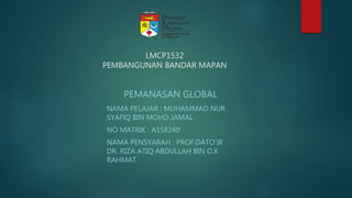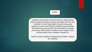 Dokumen ini membincangkan isu pemanasan global dan kenaikan aras laut yang memberi kesan kepada bandar tepi laut. Pelan tindakan untuk mengatasi masalah tersebut mengandungi langkah mitigasi seperti pengurangan penggunaan tenaga dan adaptasi seperti penanaman semula pokok serta kitar semula. Penekanan diberikan kepada tanggungjawab bersama untuk memastikan bumi berada dalam keadaan sejahtera.