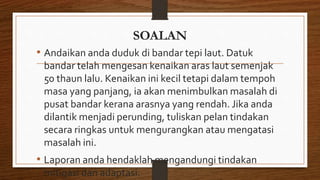 Dokumen ini membincangkan tindakan yang perlu diambil untuk mengatasi masalah pemanasan global dan kenaikan aras laut yang memberi kesan kepada bandar tepi laut. Ia mencadangkan langkah mitigasi seperti pengurangan gas rumah hijau, pemeliharaan hutan, dan kempen kitar semula, serta langkah adaptasi seperti pembinaan benteng dan pengembangan sistem perparitan. Kesemua tindakan ini bertujuan untuk melindungi ekosistem dan masyarakat yang terjejas oleh perubahan iklim.
